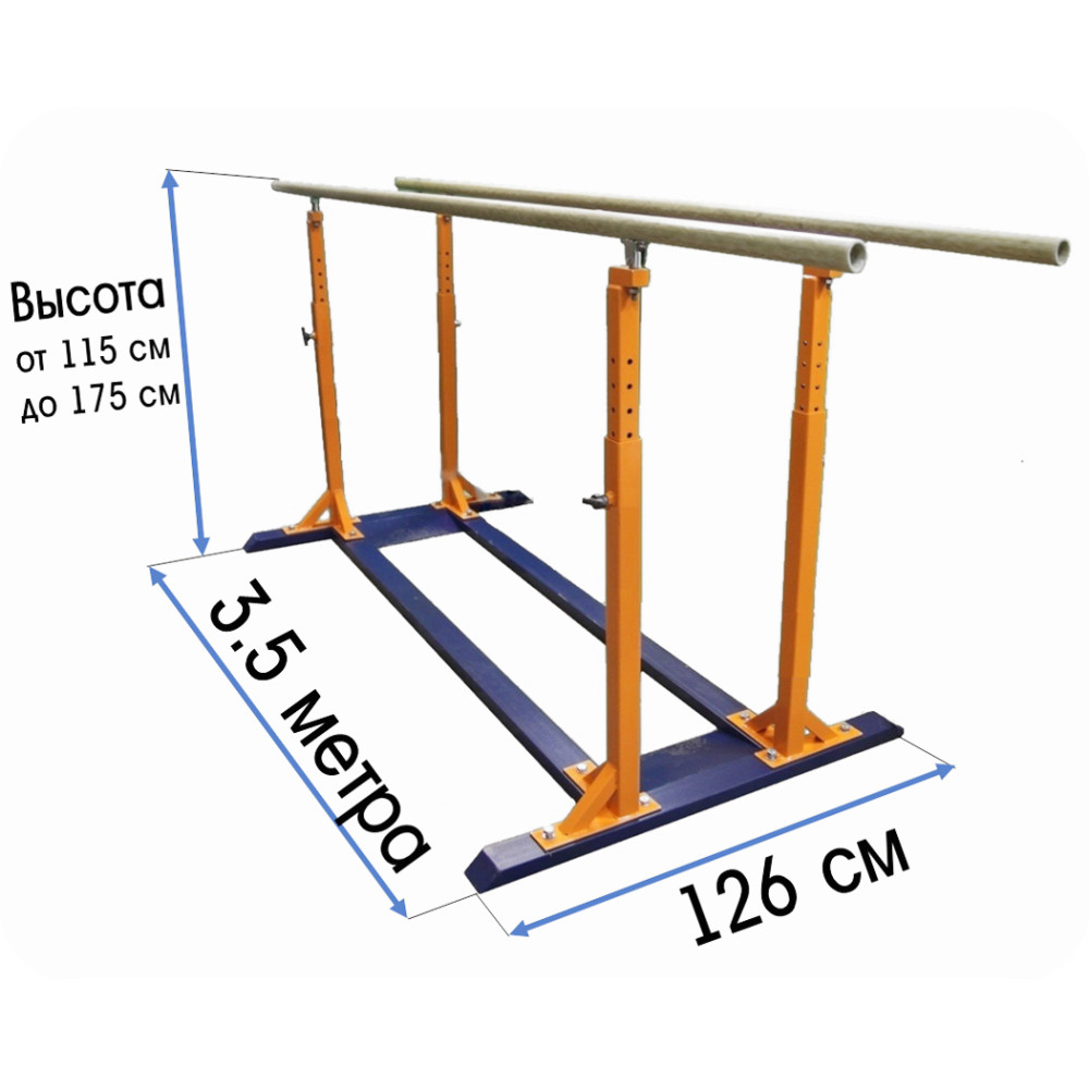 Брусья гимнастические массовые, со жердями из фибергласса. Мужские, параллельные. Длина - 3500 мм, Ширина - 1260 мм, Высота регулируемая - 1150-1750 мм. Расстояние между жердями - 380-580 мм