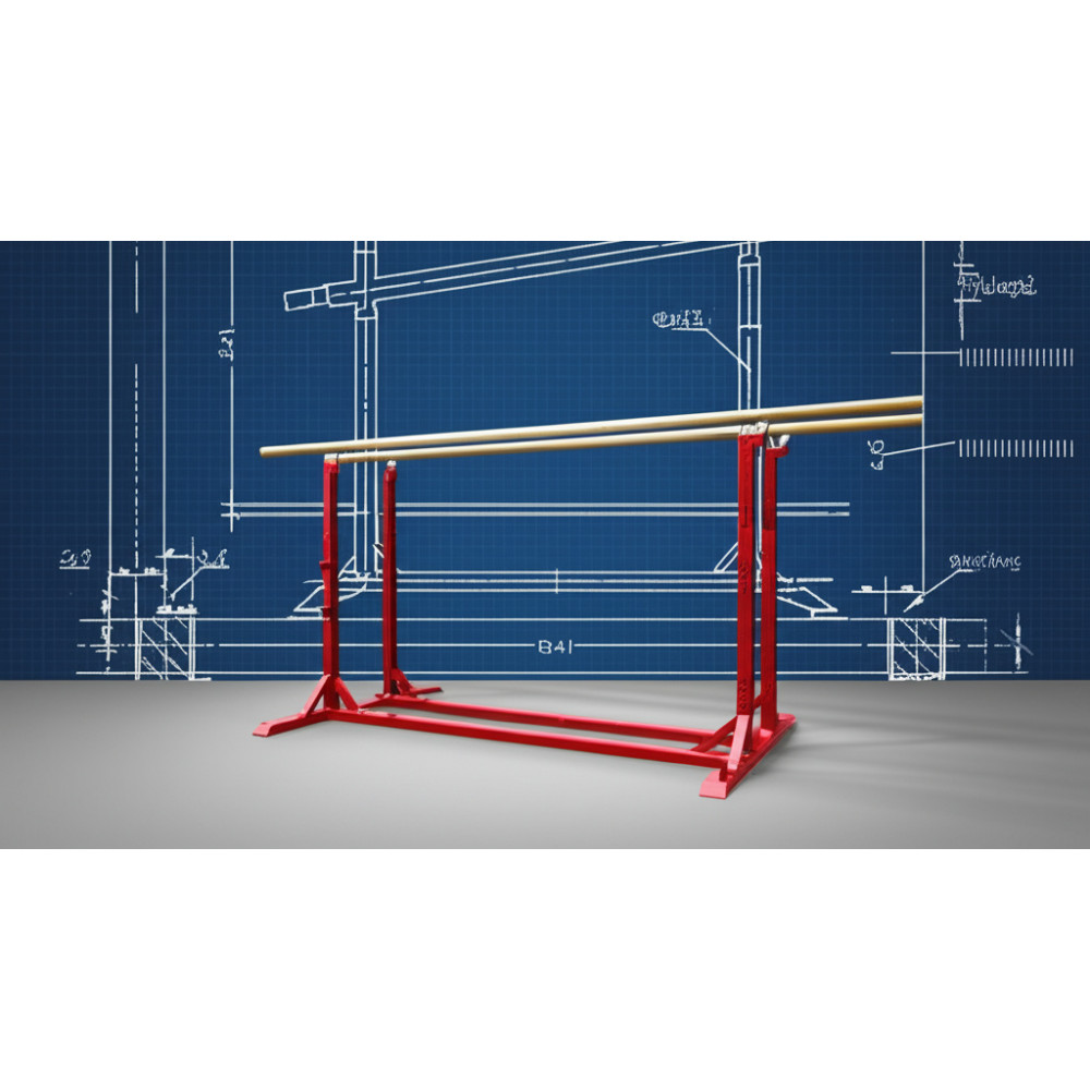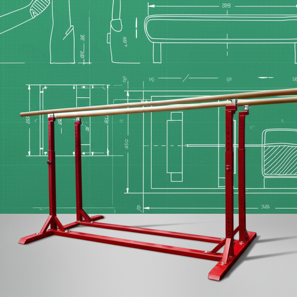 Брусья гимнастические мужские представляют собой сборную конструкцию, состоящую из рамы, четырёх стоек с механизмами зажима и фиксации, четырёх вертлюгов и двух жердей из стеклопластика (фибергласс) со стальным креплением к стойкам.