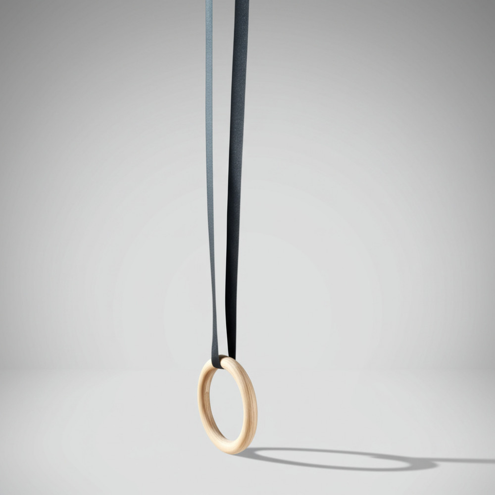 Кольца гимнастические с тросом длиной 2 метра и дополнительной стропой 1 метр, диаметром 23 см, произведённые из многослойной фанеры толщиной 30 мм.