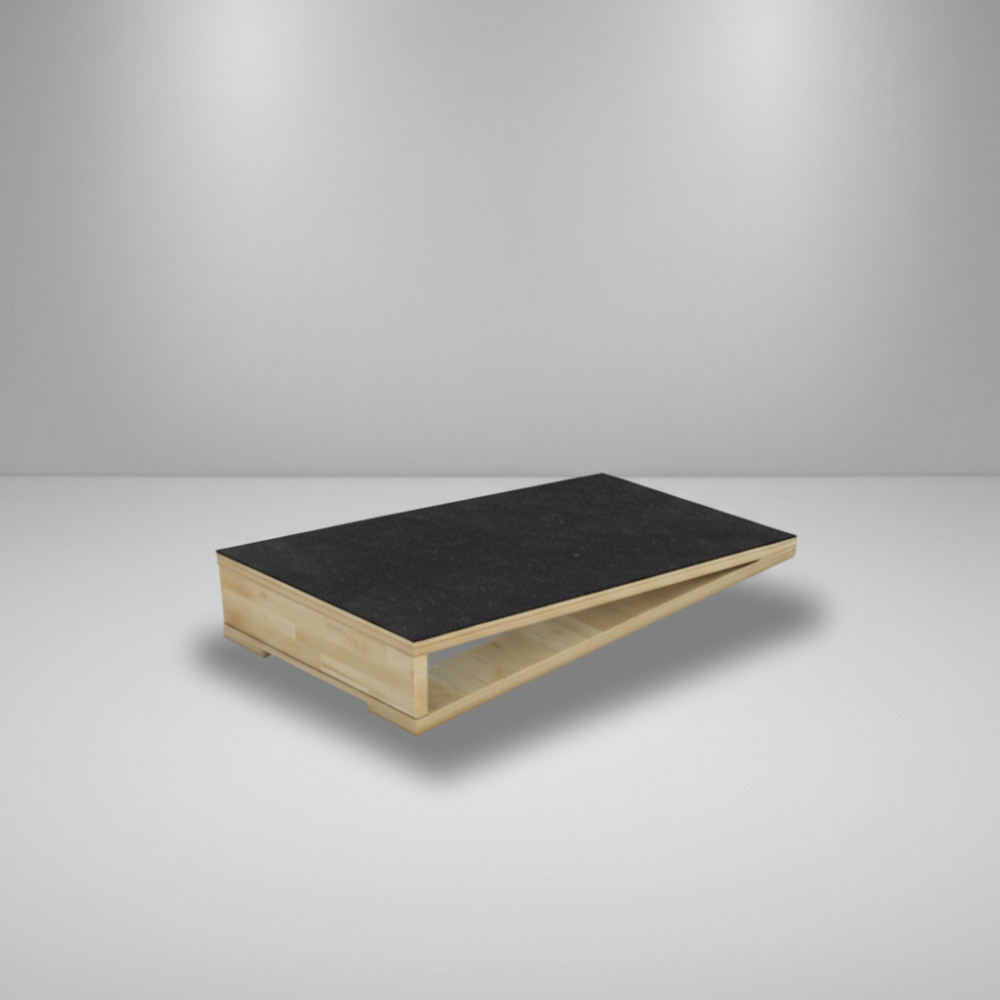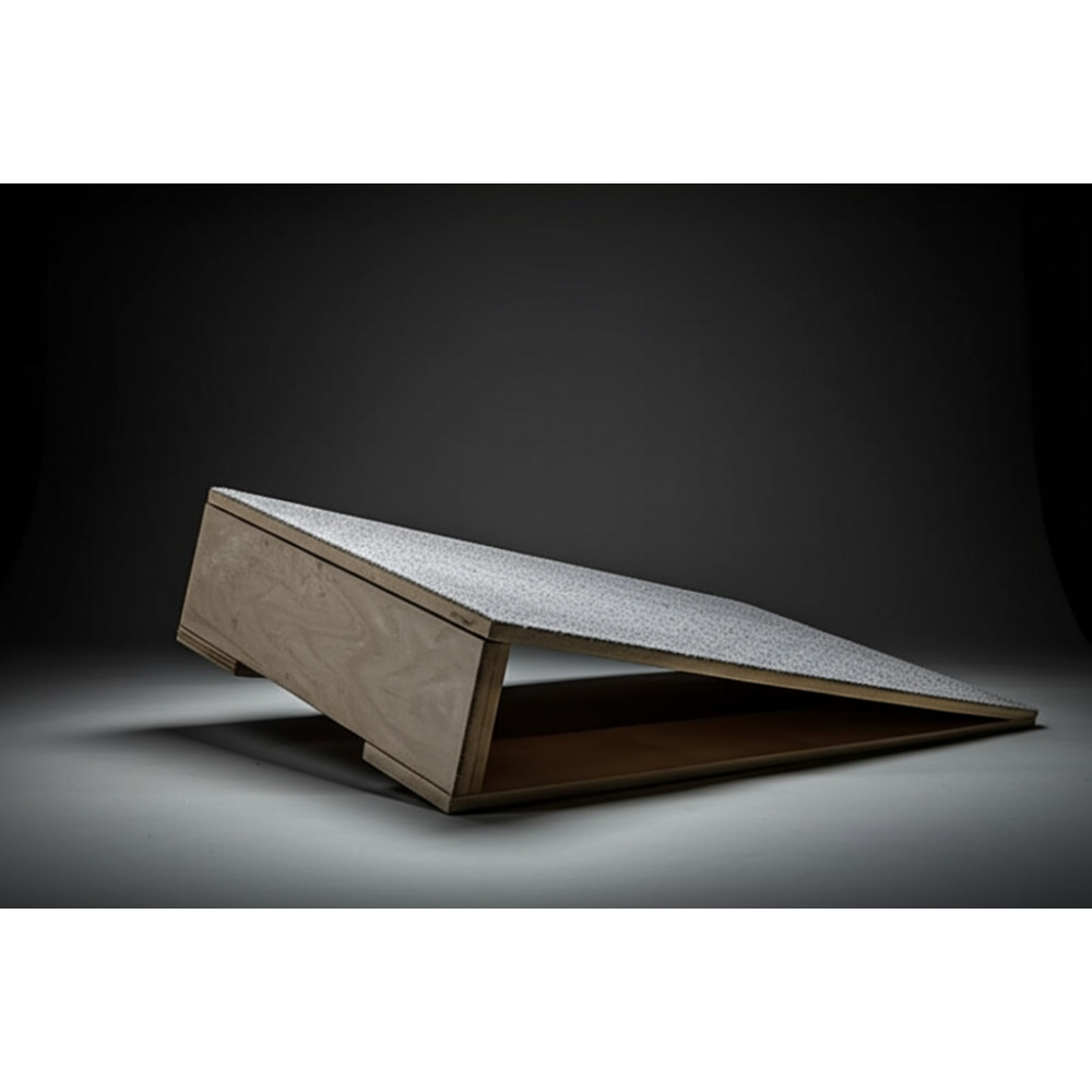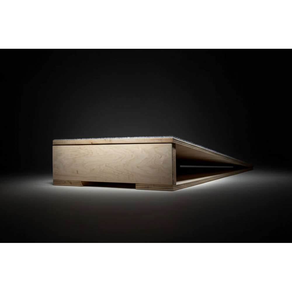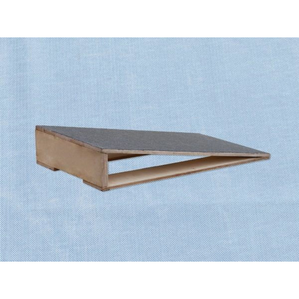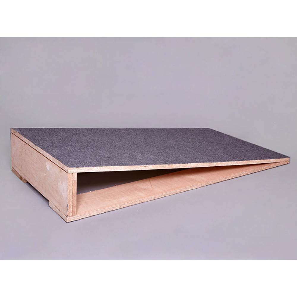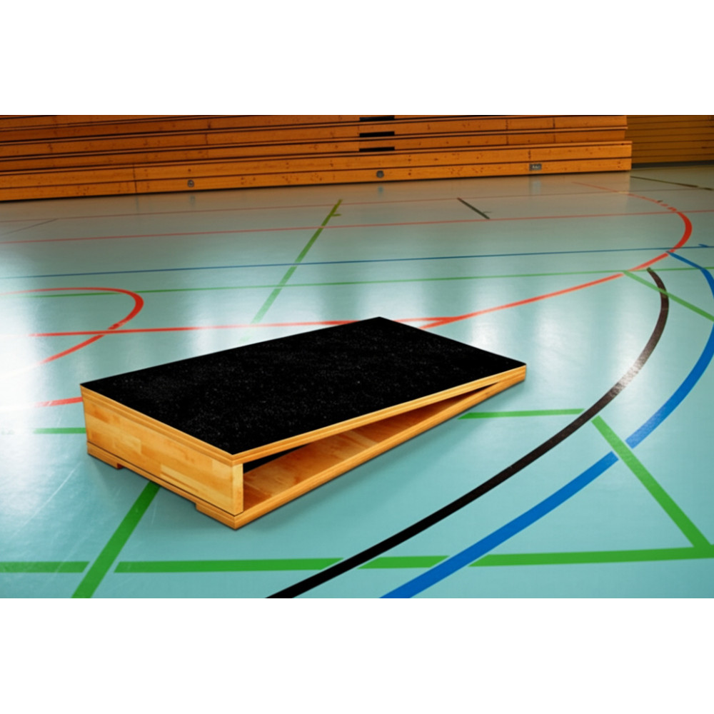 Мостик изготовлен из древесины, имеет прямую конструкцию, без пружин. Размеры изделия составляют 1200х600х185 мм. Верхняя площадка соединяется с основанием с помощью фанерной опоры, что делает мостик жестким. Верхняя поверхность покрыта ковролином, который обеспечивает хорошее сцепление, не дает скользить. Такой вид оборудования подходит для использования в школьных спортзалах.