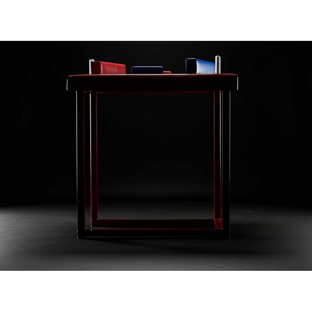 - Материалы: металлический профиль 40x40 мм и 40x20 мм; столешница обита искусственной кожей.