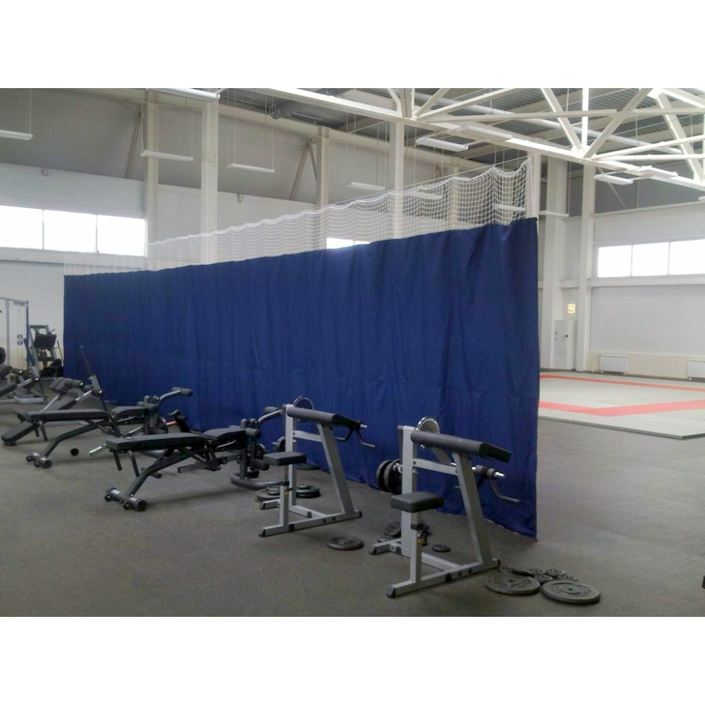 Система деления спортивного зала представляет собой комбинированное решение для разделения пространства, состоящее из верхней сетки и нижней ткани, стоимостью от 595 рублей за квадратный метр.