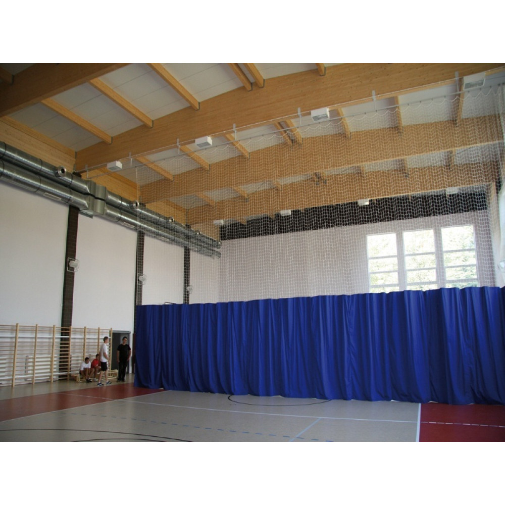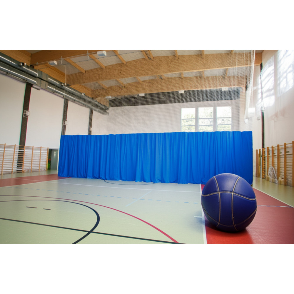 Система деления спортивного зала разработана для эффективного разделения игрового пространства на несколько зон, что позволяет проводить одновременно тренировки по различным видам спорта. Она состоит из разделительных сеток, выполненных в комбинированном исполнении: сетка и тканевое полотно.
