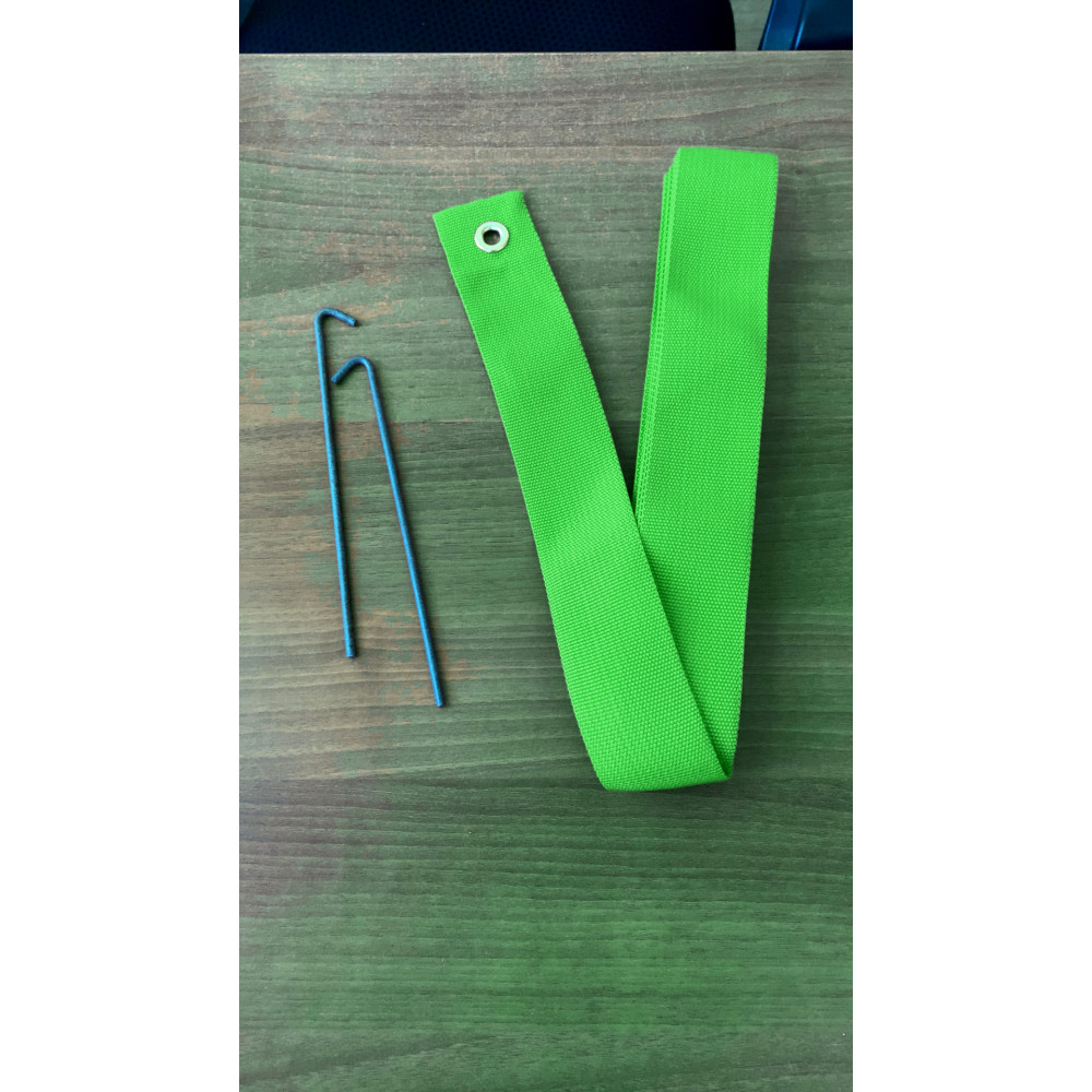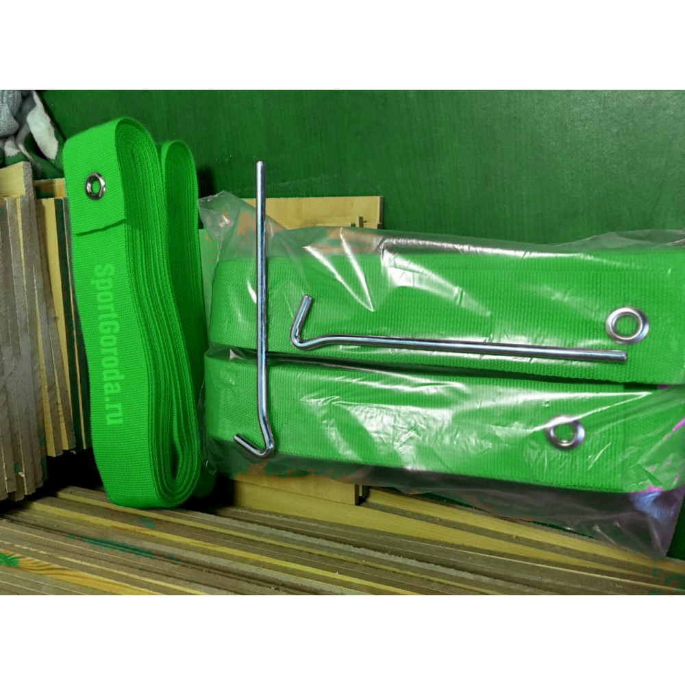 Лента зеленого цвета для разметки площадки для игры в бадминтон с размерами 13.4х6.1 метров, включающая 4 прочные ленты и 4 колышка для фиксации.