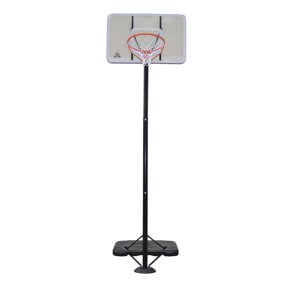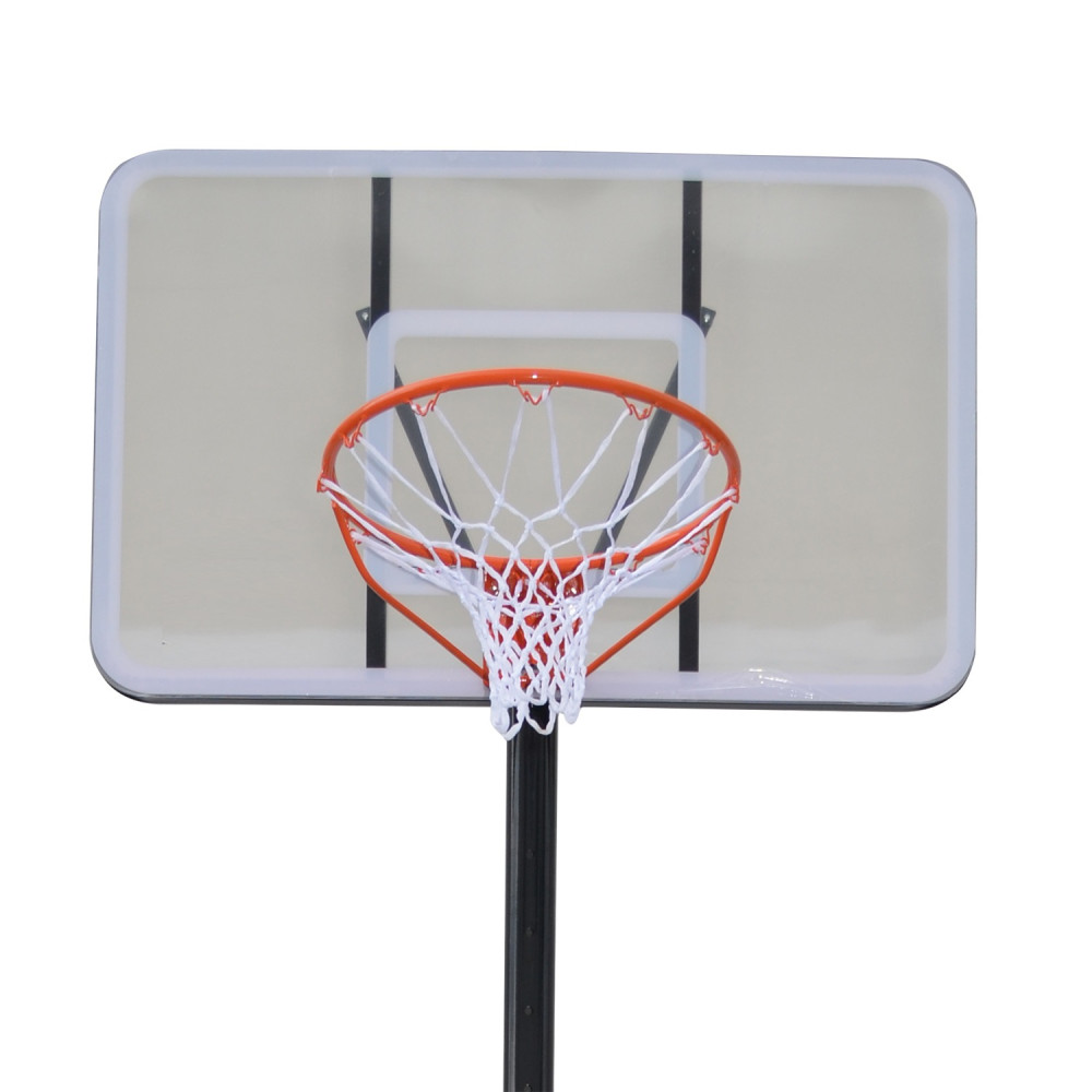 Щит стойки выполнен без рамки и произведен из поликарбоната, что обеспечивает высокую прочность и защиту от механических повреждений. В комплект входит кольцо с диаметром 45 см (красного цвета) и сетка. Модель подходит как для профессиональных, так и для любительских игр.