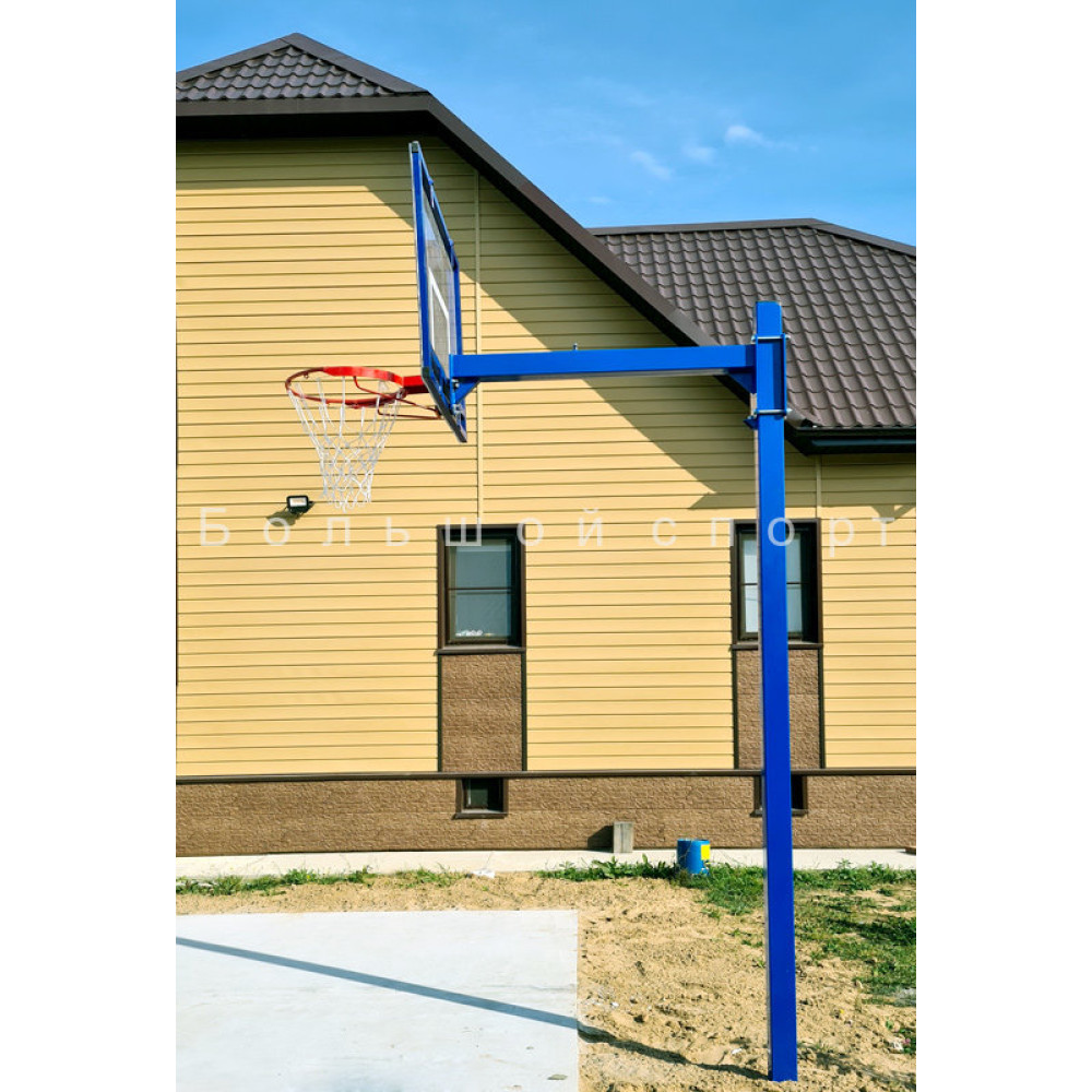 Данная стойка предназначена для установки на открытых игровых площадках и требует бетонирования для надежной фиксации. Возможна комплектация как фанерным щитом, так и щитом из оргстекла (акрил или поликарбонат) или закаленного стекла. Посадочное место для крепления щита/кольца составляет 110х100 мм.