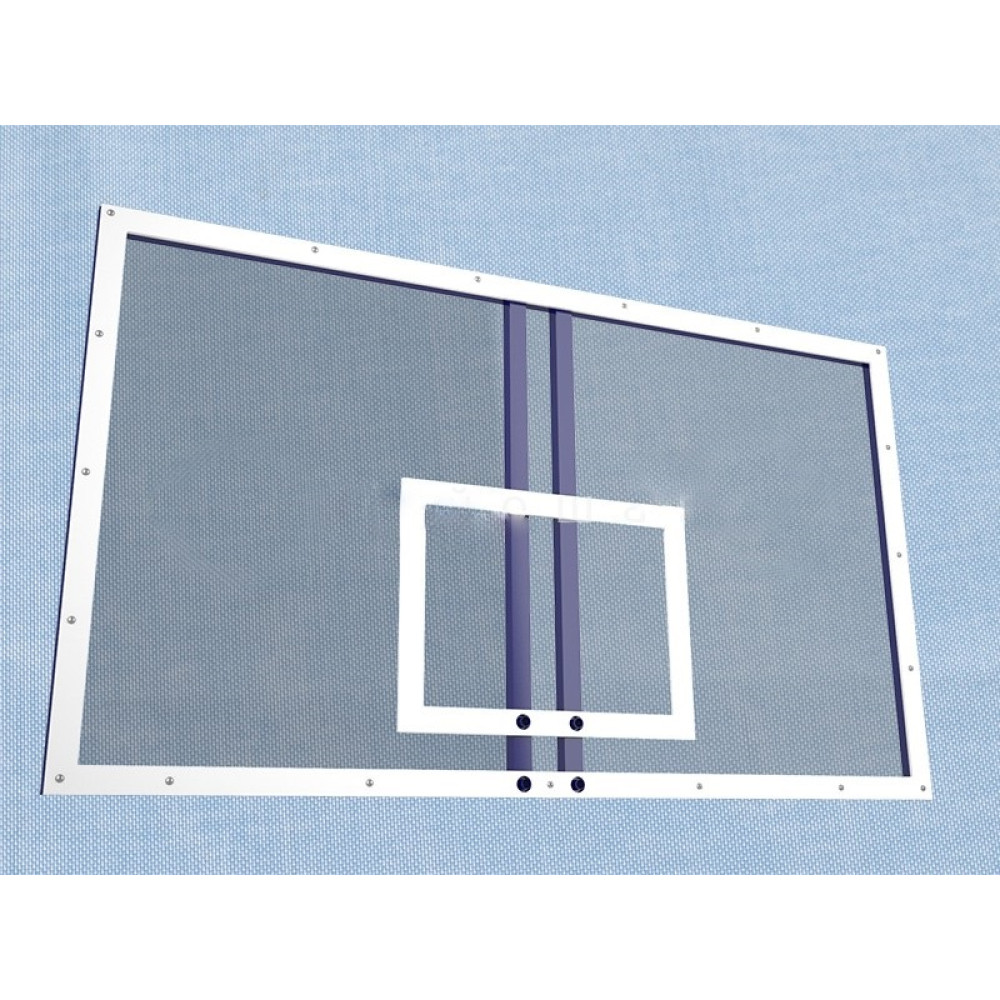 Используется цельное противоударное акриловое оргстекло толщиной 10мм., металлическая рама изготовлена из квадратного профиля 40х40мм. Рама имеет монтажные отверстия и "клыки" для крепления к ферме или стойке а также отверстия для крепления баскетбольного кольца. Посадочное место под баскетбольное кольцо размерами 100 мм. x 110 мм. Размер щита 1800 x 1050 мм, что полностью соответствует требованиям FIBA.