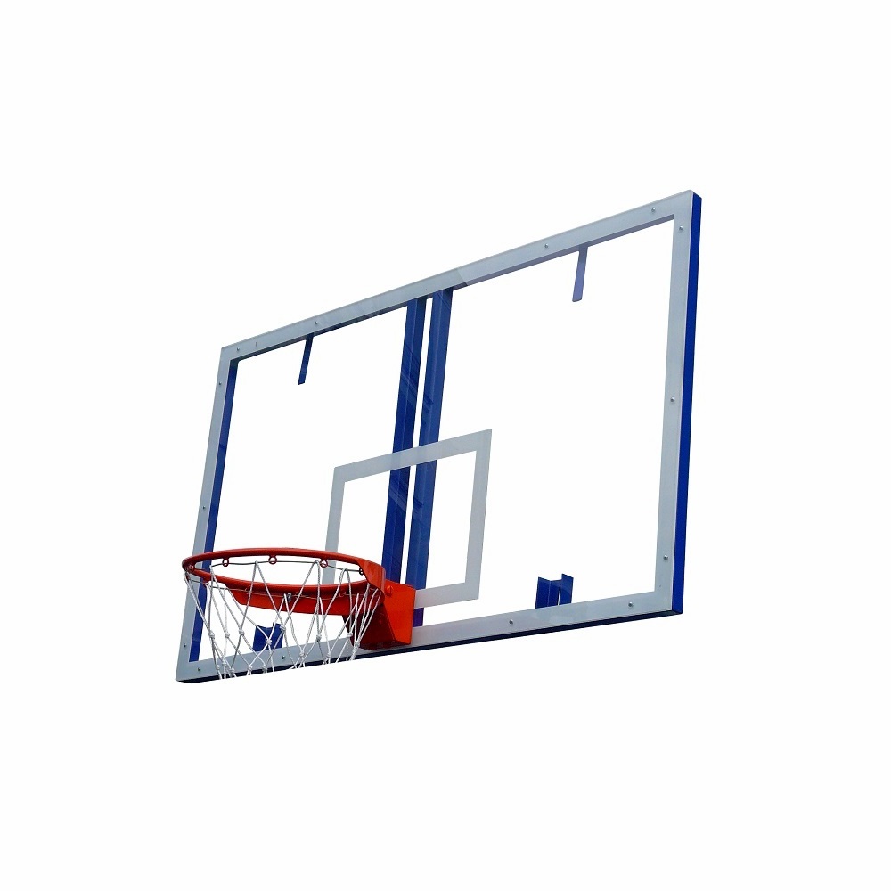 Щит баскетбольный из поликарбоната толщиной 10 мм с размерами 1800х1050 мм, оснащенный основанием из стального профиля 40х40 мм.