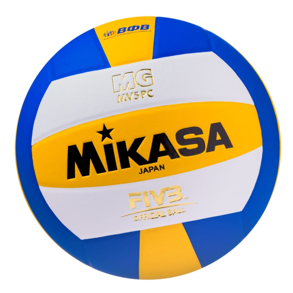 Волейбольный мяч Mikasa MV 5 PC 1/50 предназначен для любительской игры, имеет размер 5 и вес от 260 до 280 граммов, выполнен в сине-желто-белой цветовой гамме.