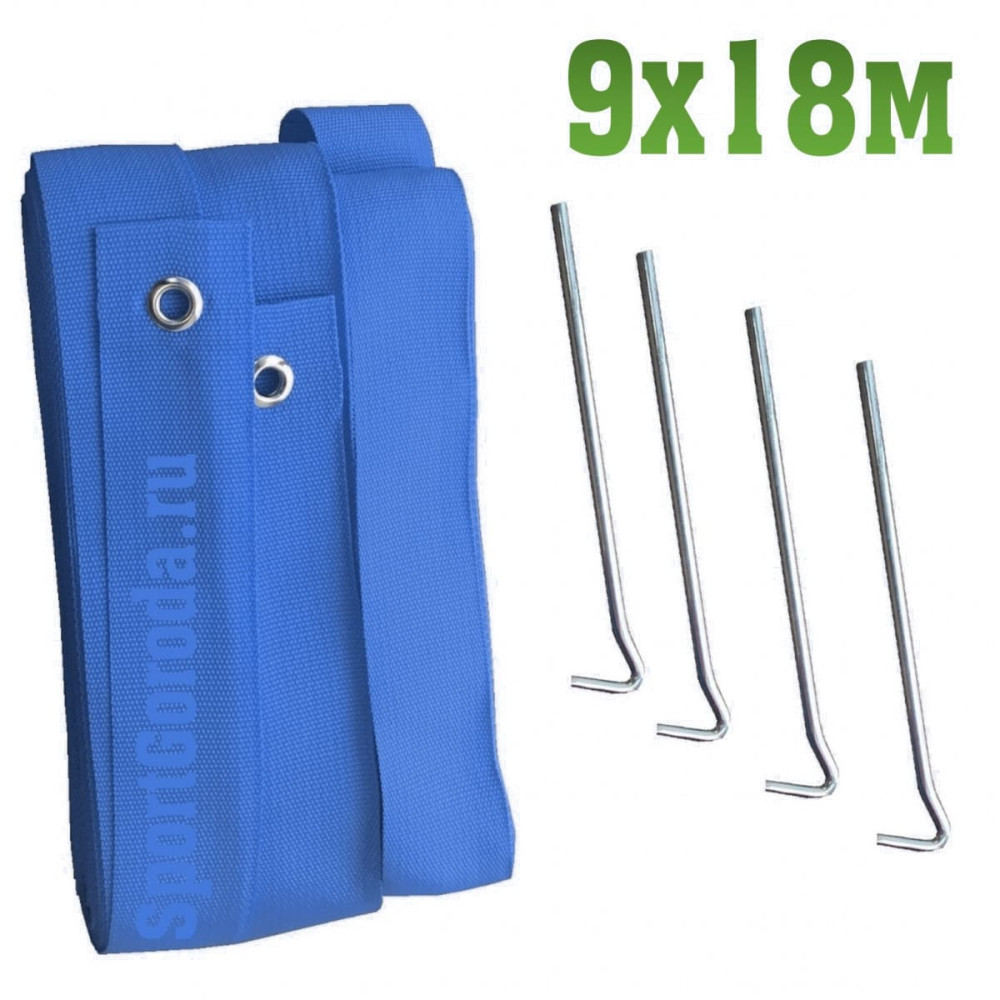 Разметка площадки для волейбола размером 9х18 м, выполненная в голубом цвете, включает 4 ленты и 4 колышка для крепления.