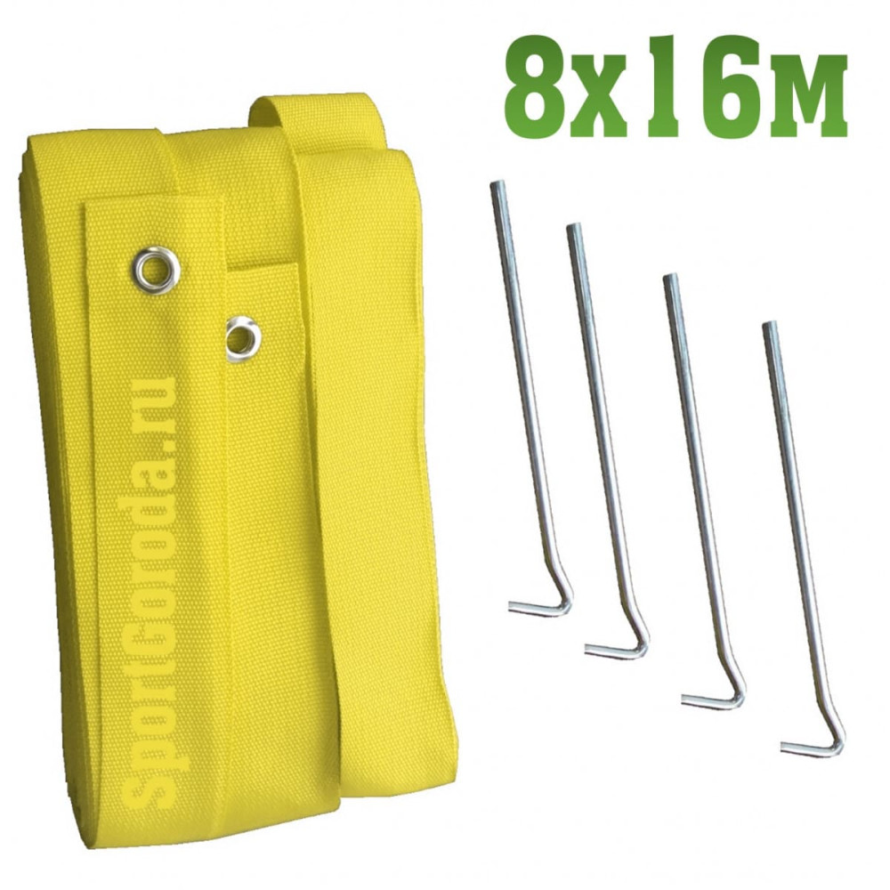 Материал сделан из прочного полиэстера жёлтого цвета с люверсами. Цвет не теряет яркость в течении времени. В комплект идет 4 металлических крепления для соединения лент через люверсы. Разметка это ограничения, которые наносятся на поверхность. Эти линии спортивнойплощадки в соответствии с правилами данной игры.