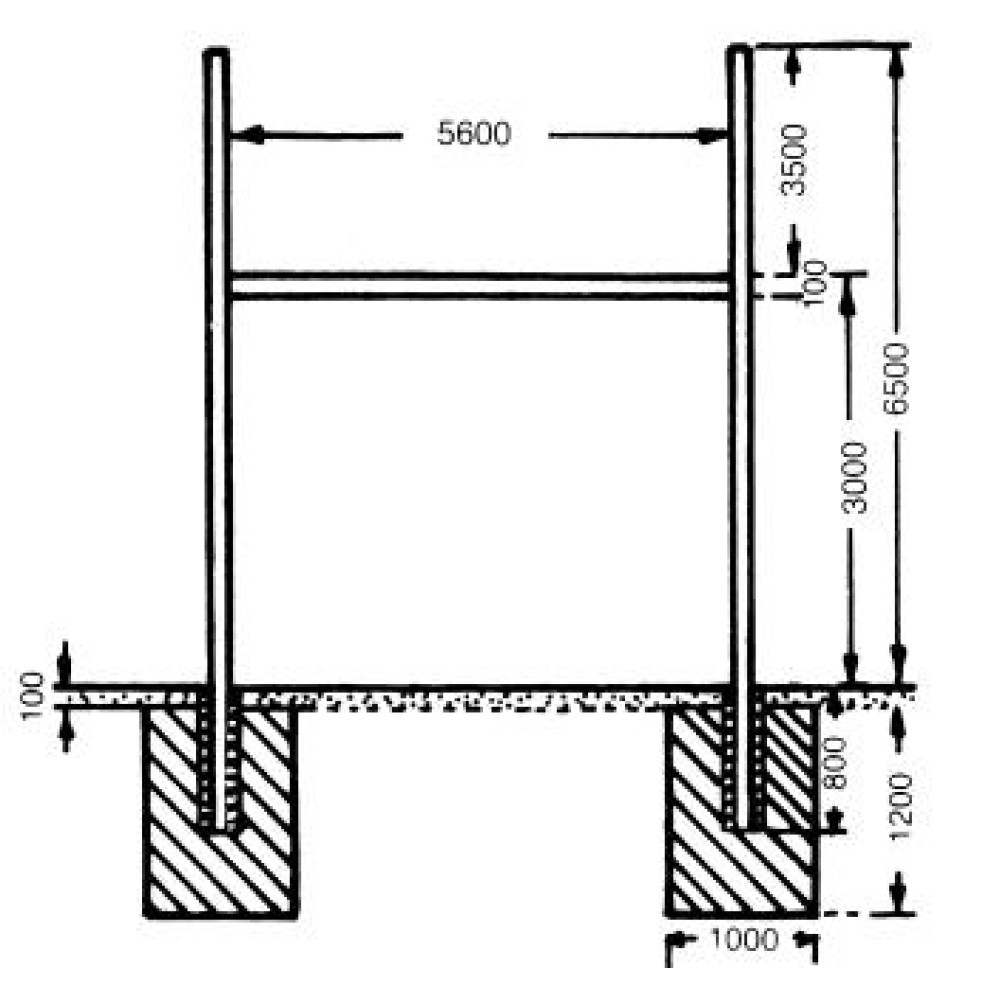 Монтаж стоек осуществляется в закладные стаканы на глубину 800 мм, перекладина крепится на высоте 3 метра с помощью специальных кронштейнов в комплекте.