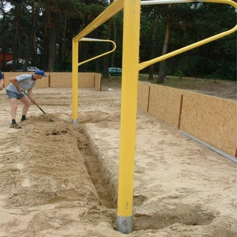 Ворота состоят из двух алюминиевых вертикальных стоек, соединённых специализированной горизонтальной перекладиной, что обеспечивает их устойчивость и долговечность во время игр на пляже.
