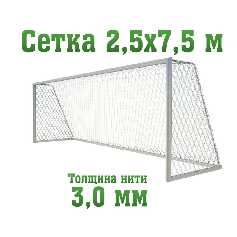Сетка для футбольных ворот полупрофессионального级а с размерами 750х250х100х200 см и толщиной 3 мм, обеспечивает надежную защиту от ударов мячом.