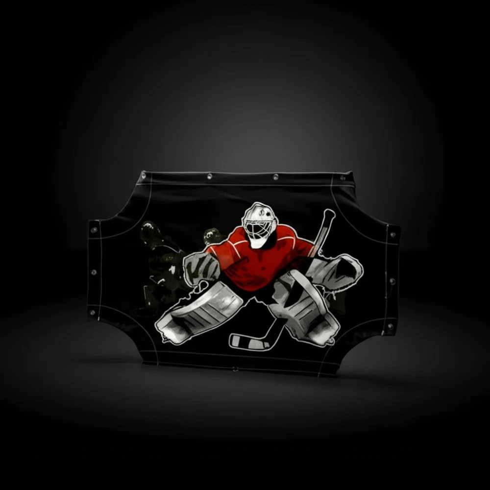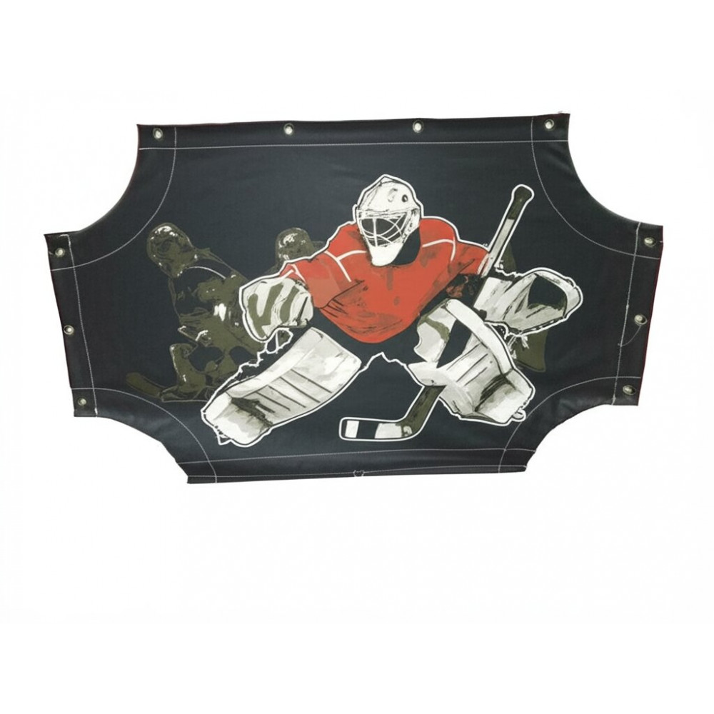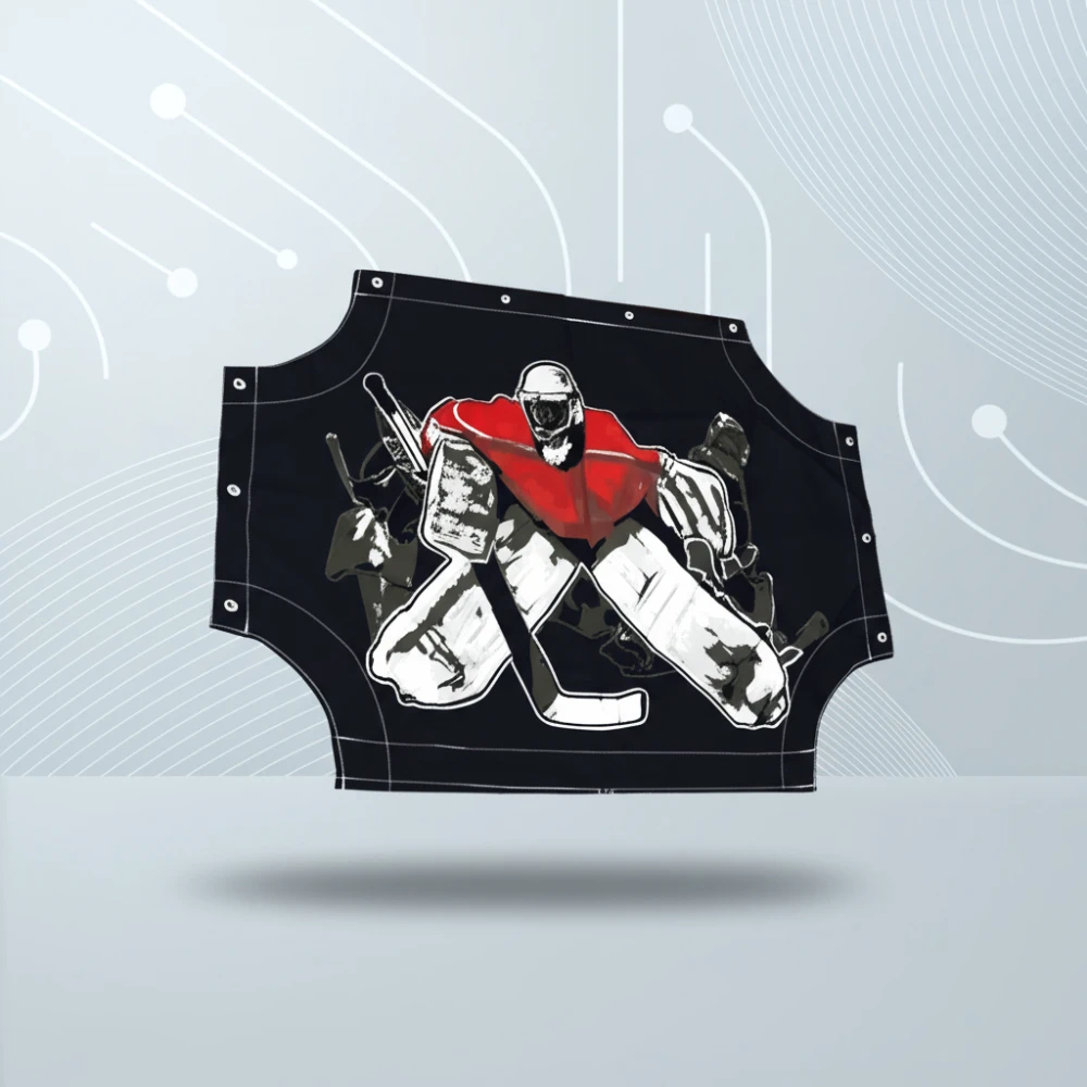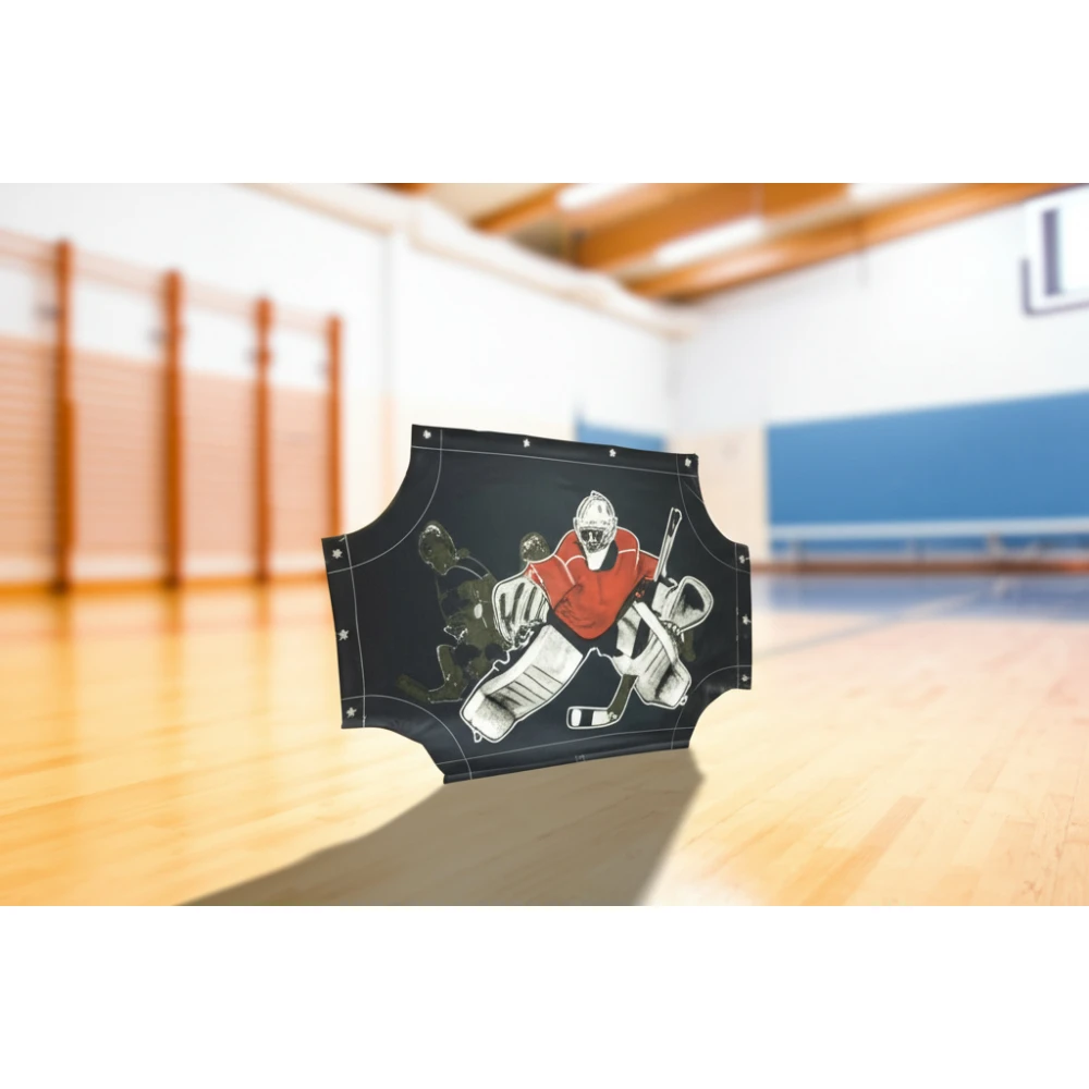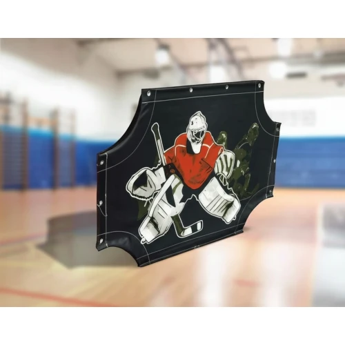 Профессиональный имитатор вратаря для стандартных хоккейных ворот (1,80 х 1,20 м). Ключевые параметры: • Материал: ударопрочная ПВХ-ткань, выдерживающая мощные броски. • Крепление: эластичные ремни для монтажа за 2 минуты. • Конструкция: утяжелители по нижнему краю для стабильности на льду. • Назначение: для хоккейных школ, клубов и ледовых арен.