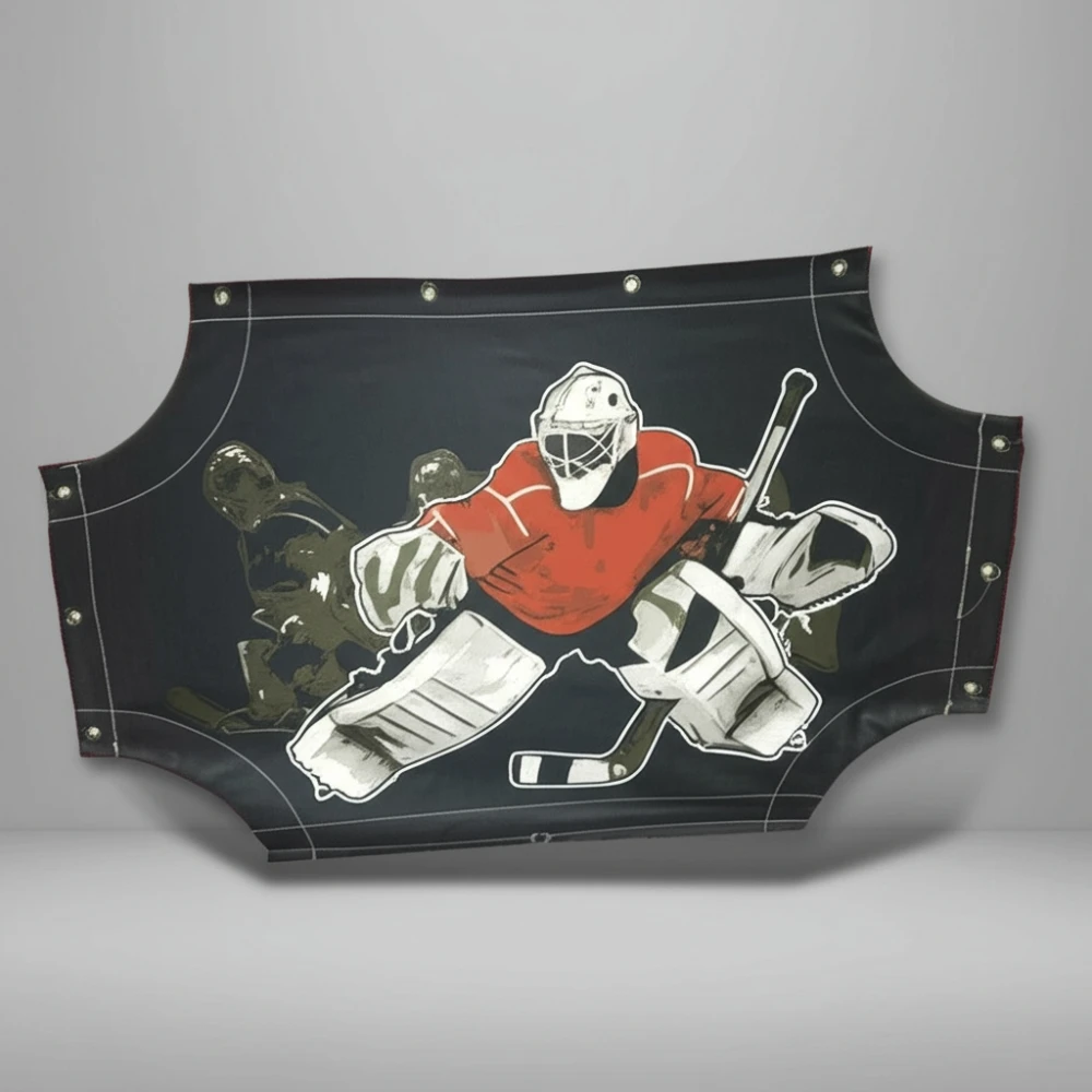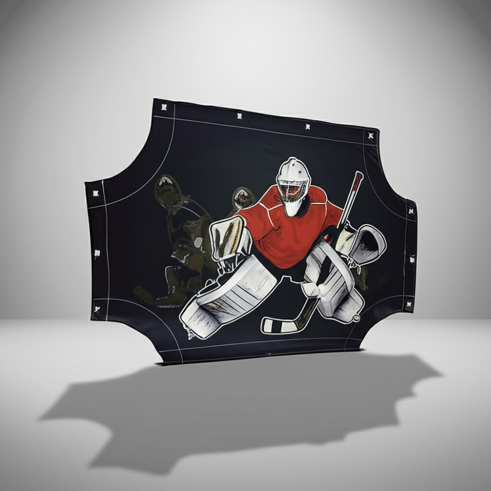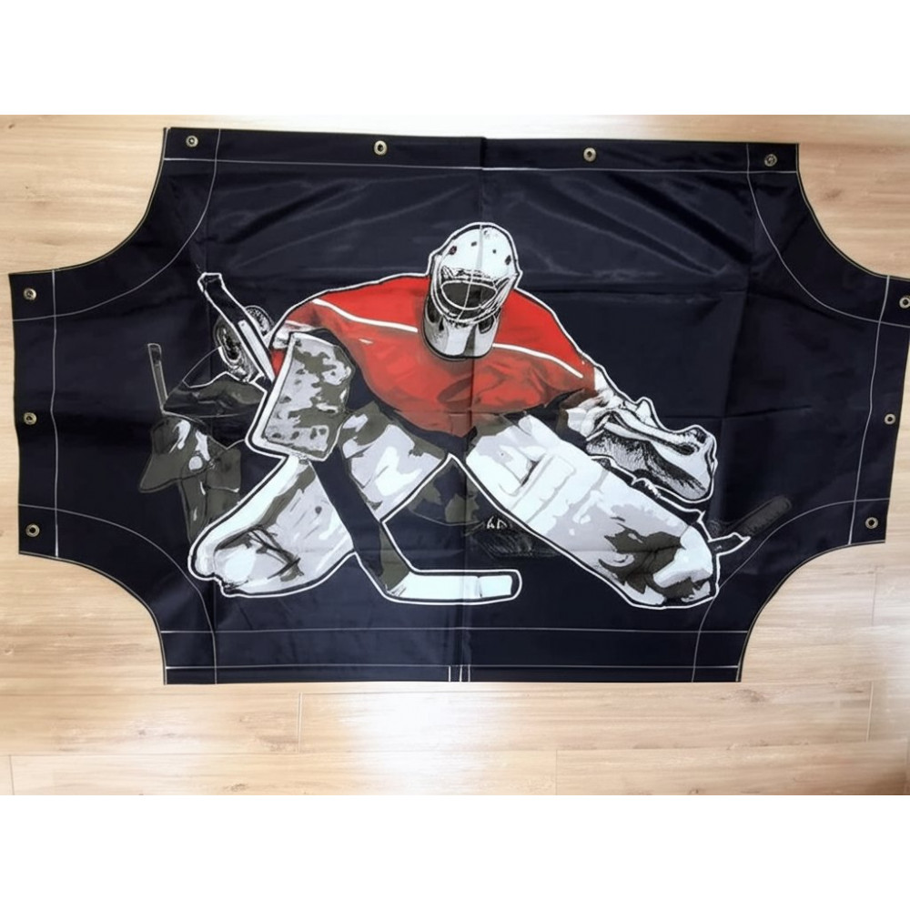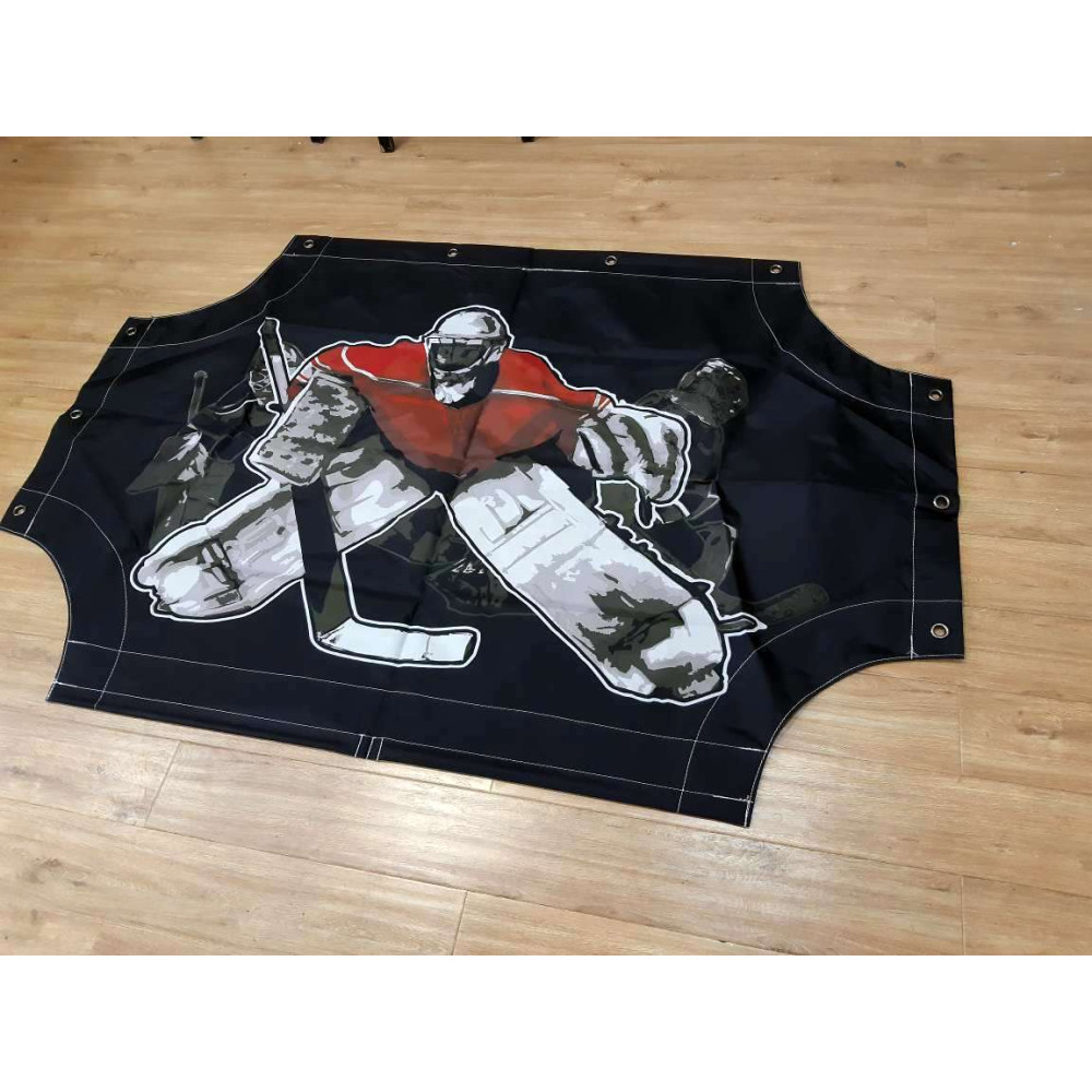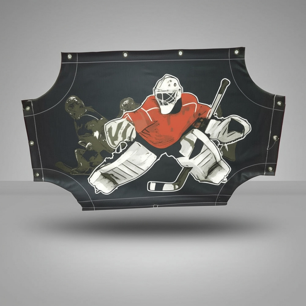 Профессиональный имитатор вратаря для стандартных хоккейных ворот (1,80 х 1,20 м). Ключевые параметры: • Материал: ударопрочная ПВХ-ткань, выдерживающая мощные броски. • Крепление: эластичные ремни для монтажа за 2 минуты. • Конструкция: утяжелители по нижнему краю для стабильности на льду. • Назначение: для хоккейных школ, клубов и ледовых арен.