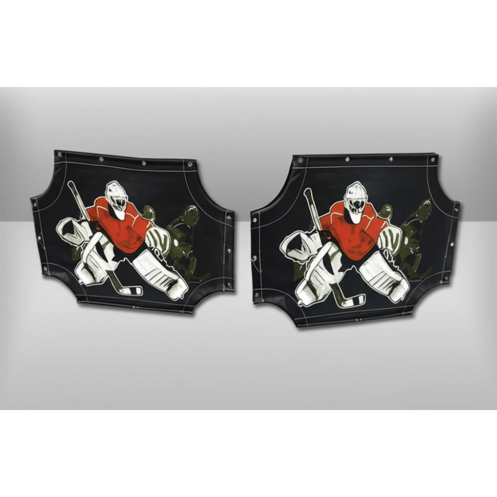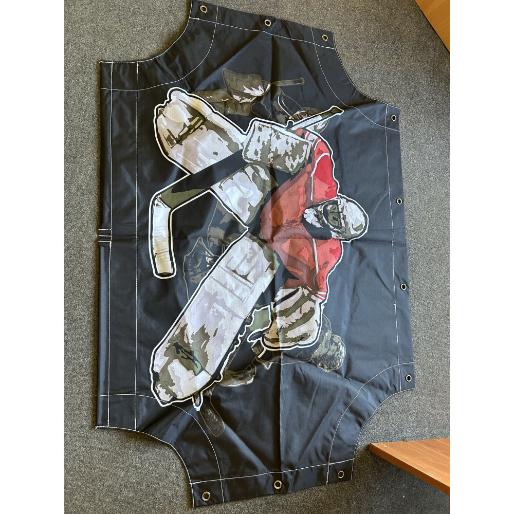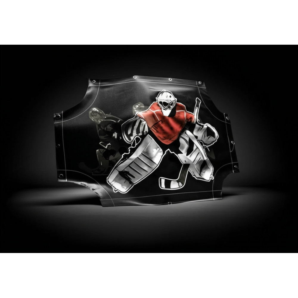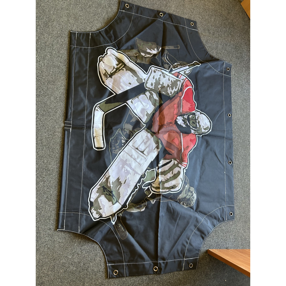 Профессиональный имитатор вратаря для стандартных хоккейных ворот (1,80 х 1,20 м). Ключевые параметры: • Материал: ударопрочная ПВХ-ткань, выдерживающая мощные броски. • Крепление: эластичные ремни для монтажа за 2 минуты. • Конструкция: утяжелители по нижнему краю для стабильности на льду. • Назначение: для хоккейных школ, клубов и ледовых арен.