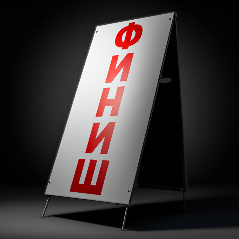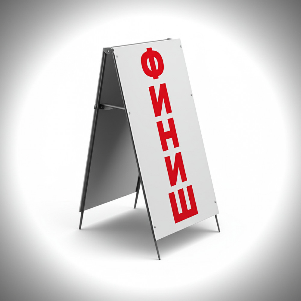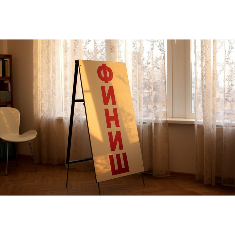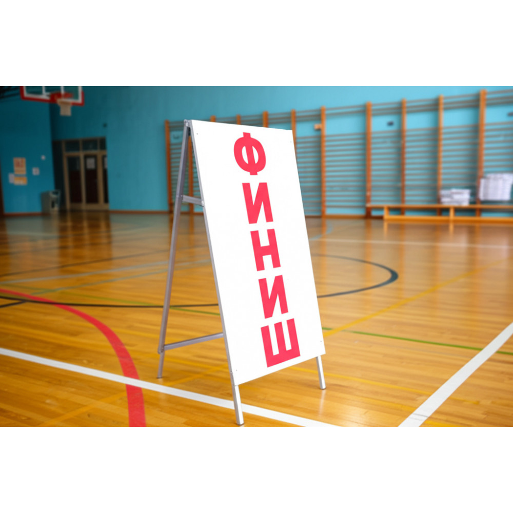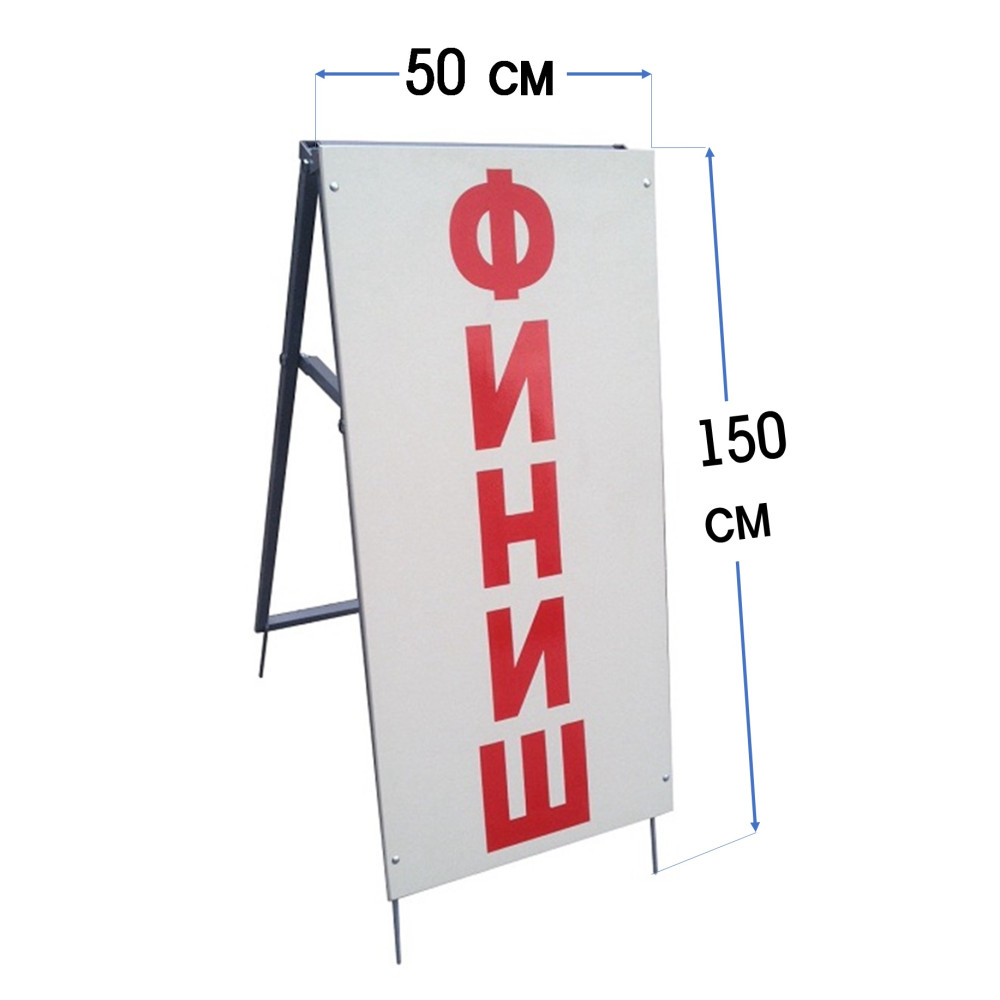 Стойка старт-финиш выполнена на прочном металлическом каркасе и изготовлена из влагостойкой фанеры, высота которой составляет 1500 мм, а ширина - 500 мм.
