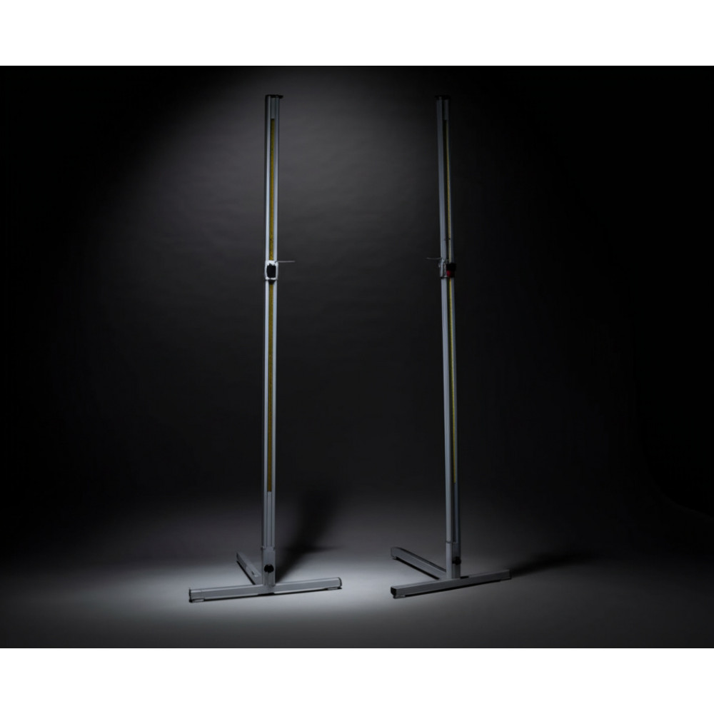 Данный комплект стоек идет с алюминиевой стойкой длиной 3 метра. Конструкция стоит на двух Т-образных основаниях. Стойки фиксируются крепежными винтами. На выдвижные стойки установлены подвижные кронштейны с полками для планки, полки регулируются по высоте и закрепляются с помощью прижимных винтов.
