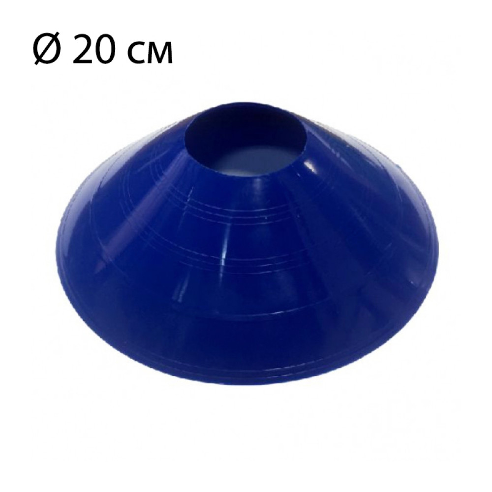 Конус разметочный синего цвета, диаметром 20 см и высотой 5 см, предназначен для размечания площадок и тренировки ловкости и скорости спортсменов.