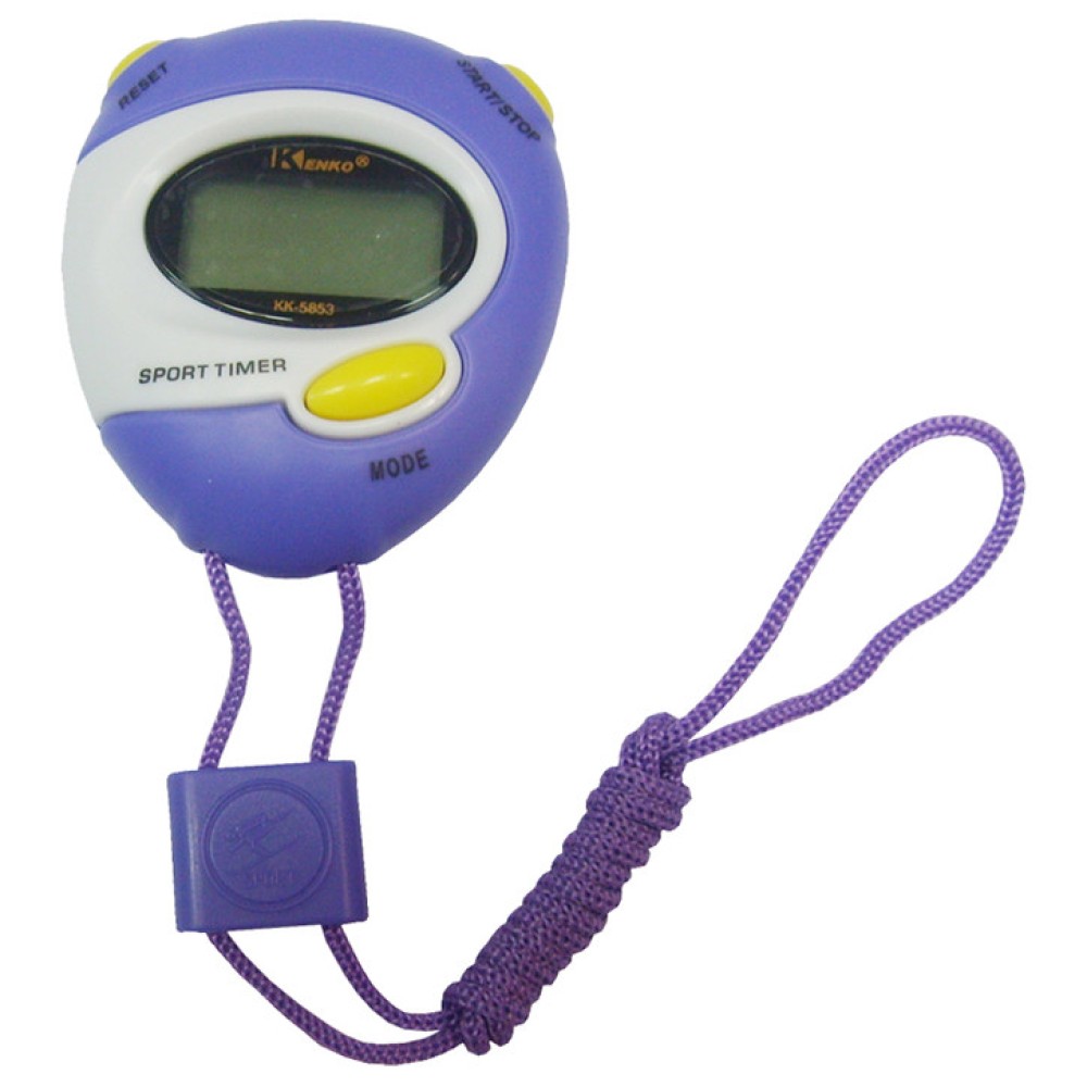 Большой пластиковый секундомер с тремя кнопками (Kenko KK-5853), одноразрядным шестизначным дисплеем. Оснащен функциями установки даты, времени и будильника. Работает при температуре от -10 до +50 °C.