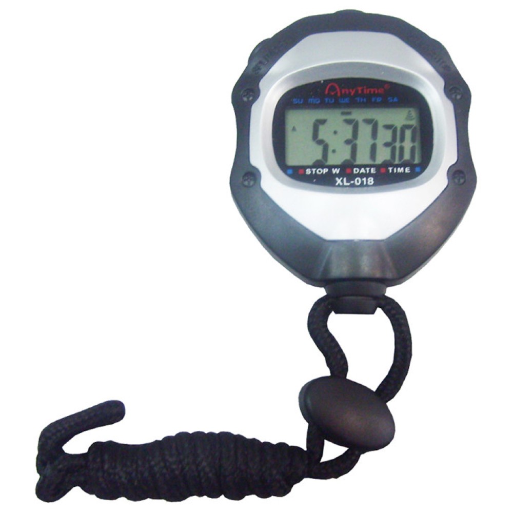 AnyTime XL-018 – цифровой секундомер с точностью 1/100 секунды, диапазоном до 24 часов, функцией отсечек, встроенными часами, календарём и будильником, крупным LCD-дисплеем, тремя кнопками управления, влагозащитным пластиковым корпусом, питанием от батарейки AG13, компактными размерами (6,5×8,3×1,5 см), весом около 40 г и нейлоновым шнурком в комплекте.
