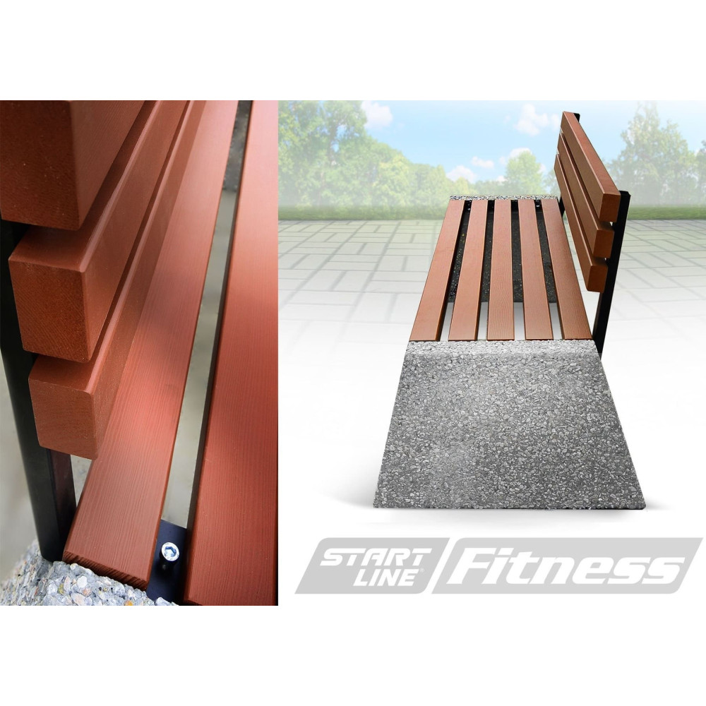 Конструкция скамейки не требует специальной установки благодаря своему весу в 215 кг, что обеспечивает её устойчивость и надёжность в эксплуатации.