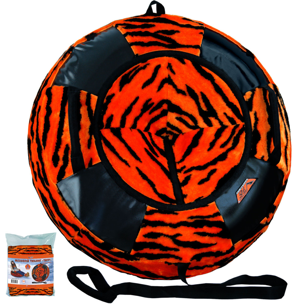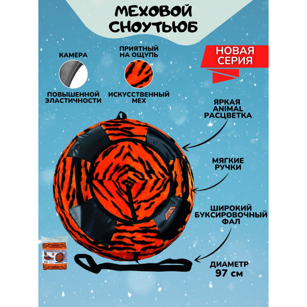 Сноутьюб V76 МЕХОВОЙ ТИГР с сиденьем, диаметром 97 см, создан для комфортного катания по снежным склонам, обеспечивая высокий уровень удобства и безопасности.