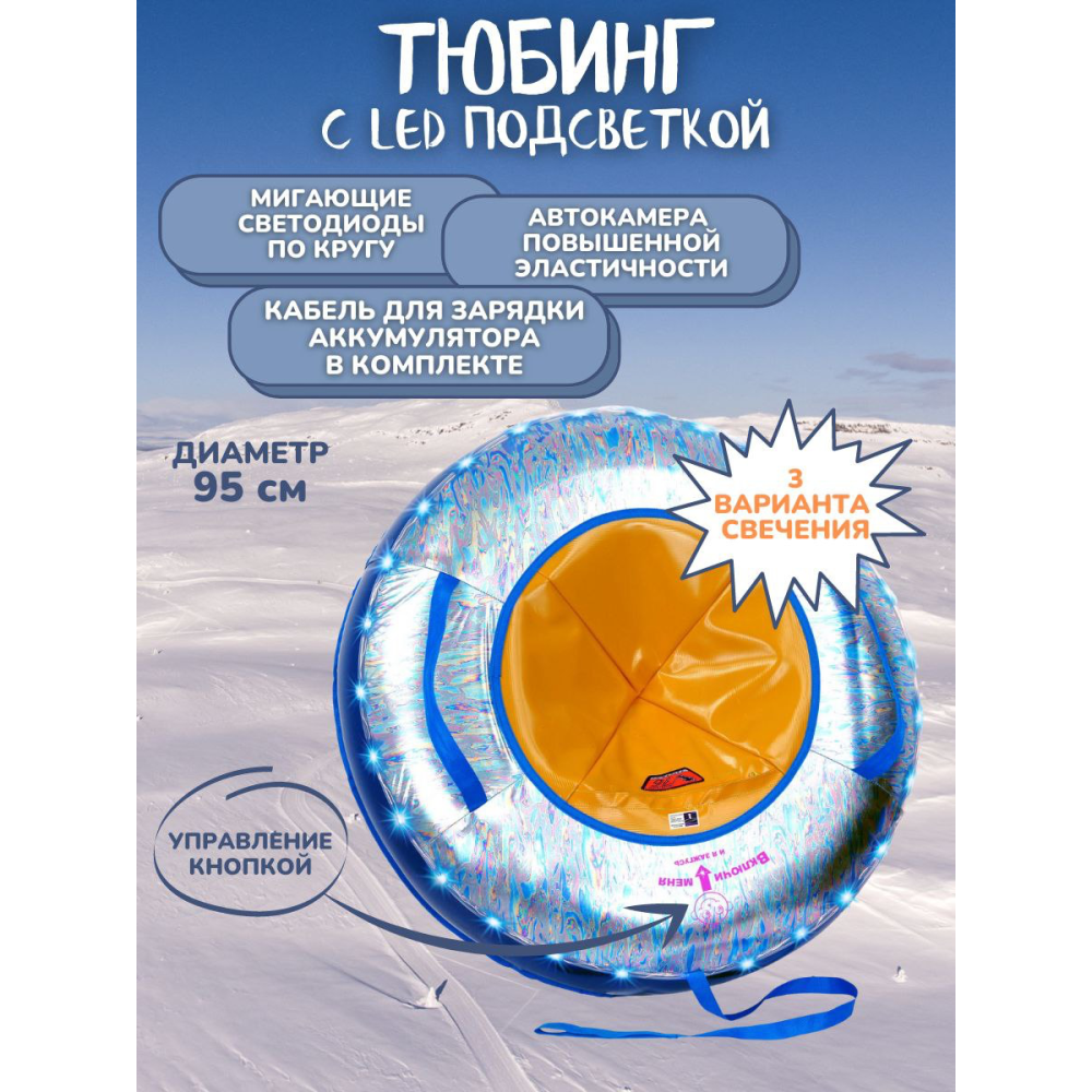 ААлексей Б. Оценка покупки 5.015 Февраля, 2020Сноутьюб отлично подходит для зимнего отдыха с друзьями и детьми. Использовали его на протяжении всей зимы, проводя выходные на склонах. Диаметр 95 см позволяет кататься как детям, так и взрослым, что очень удобно. Особо радуют светодиоды - выглядит привлекательно, особенно в темное время суток.