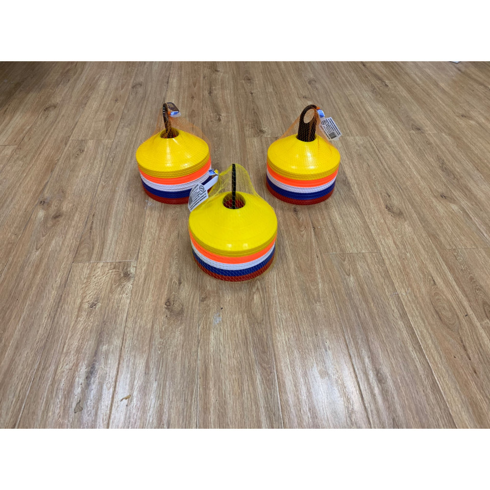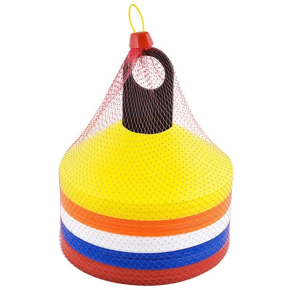 Фишки для разметки поля в количестве 50 штук, высотой 5 см и диаметром 19,5 см, представлены в различных цветах: оранжевый, красный, желтый, белый и синий.