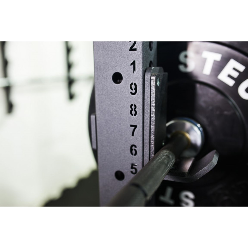 Опорные стойки оснащены перфорацией с переменным шагом 50 и 30 мм между центрами отверстий. Это обеспечивает правильную настройку страховочных упоров и уровня безопасности для атлета, что критически важно при выполнении приседаний и жима лежа.