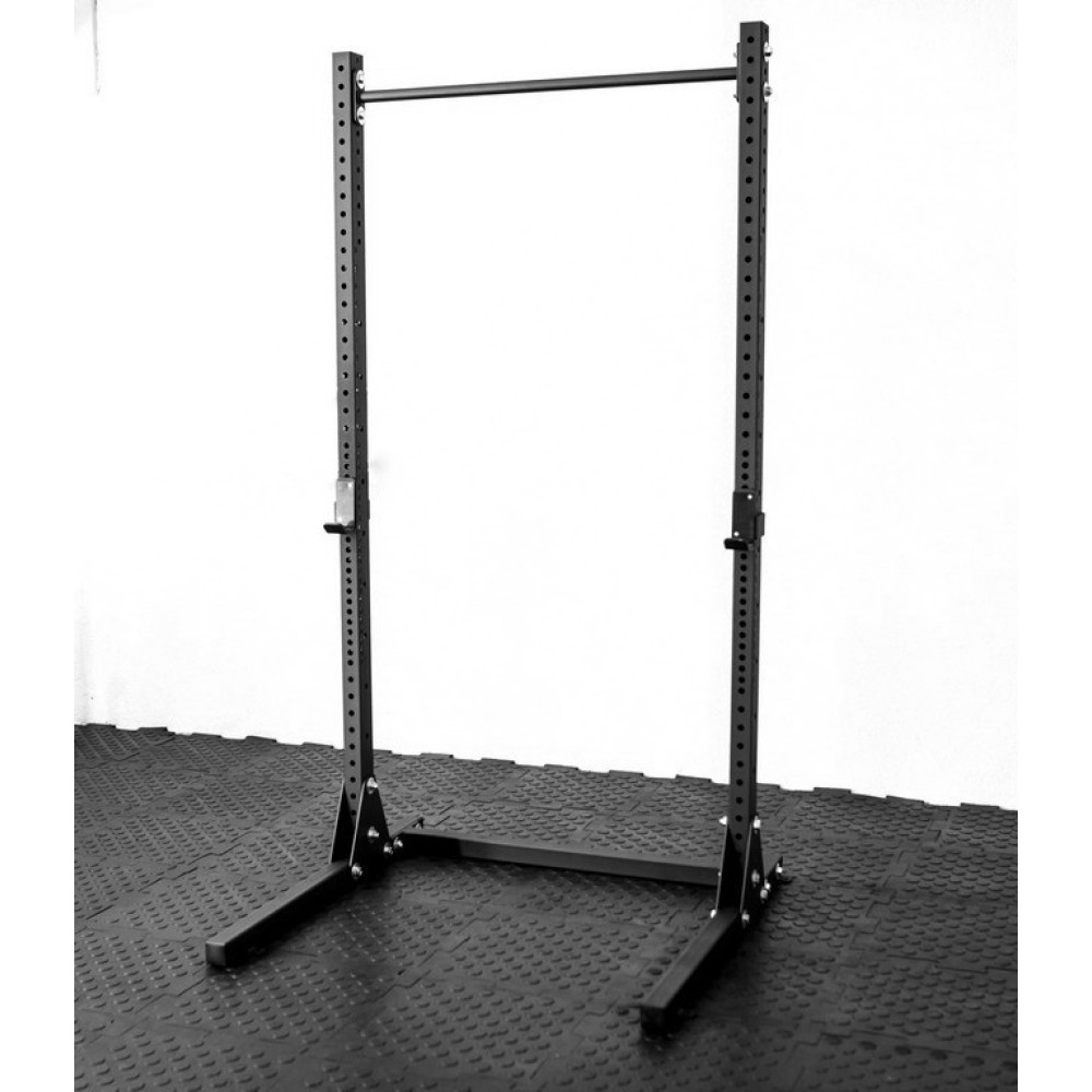 Стойка изготовлена из толстостенных профильных труб с толщиной стенки не менее 3 мм, что обеспечивает высокий запас прочности и устойчивость даже при максимальных нагрузках. Дополнительно, основание стойки имеет монтажные пластины с отверстиями для крепления к полу, повышающие устойчивость и безопасность при выполнении динамичных упражнений.