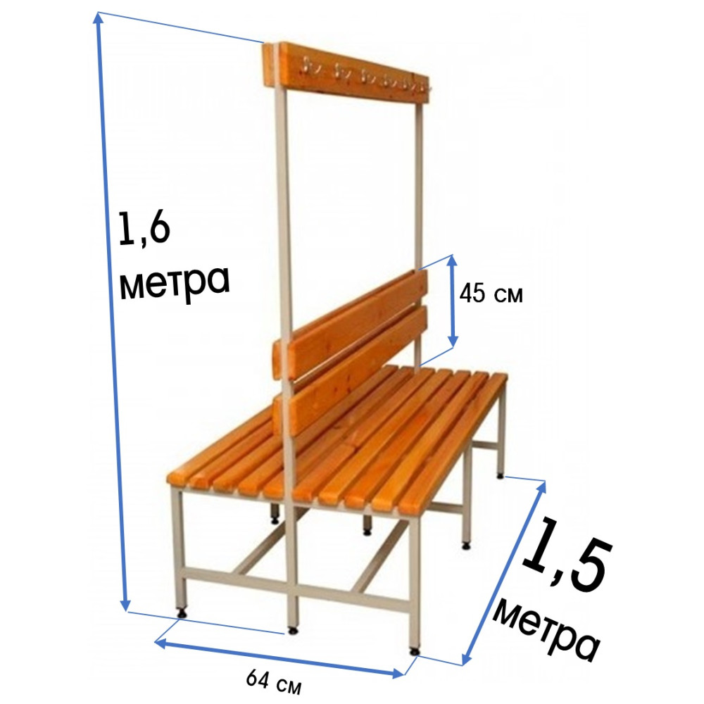 Скамейка для раздевалок с вешалкой двухсторонняя, длиной 1,5 м, предназначенная для установки в общественных местах, таких как школы, спортивные комплексы и фитнес-центры.