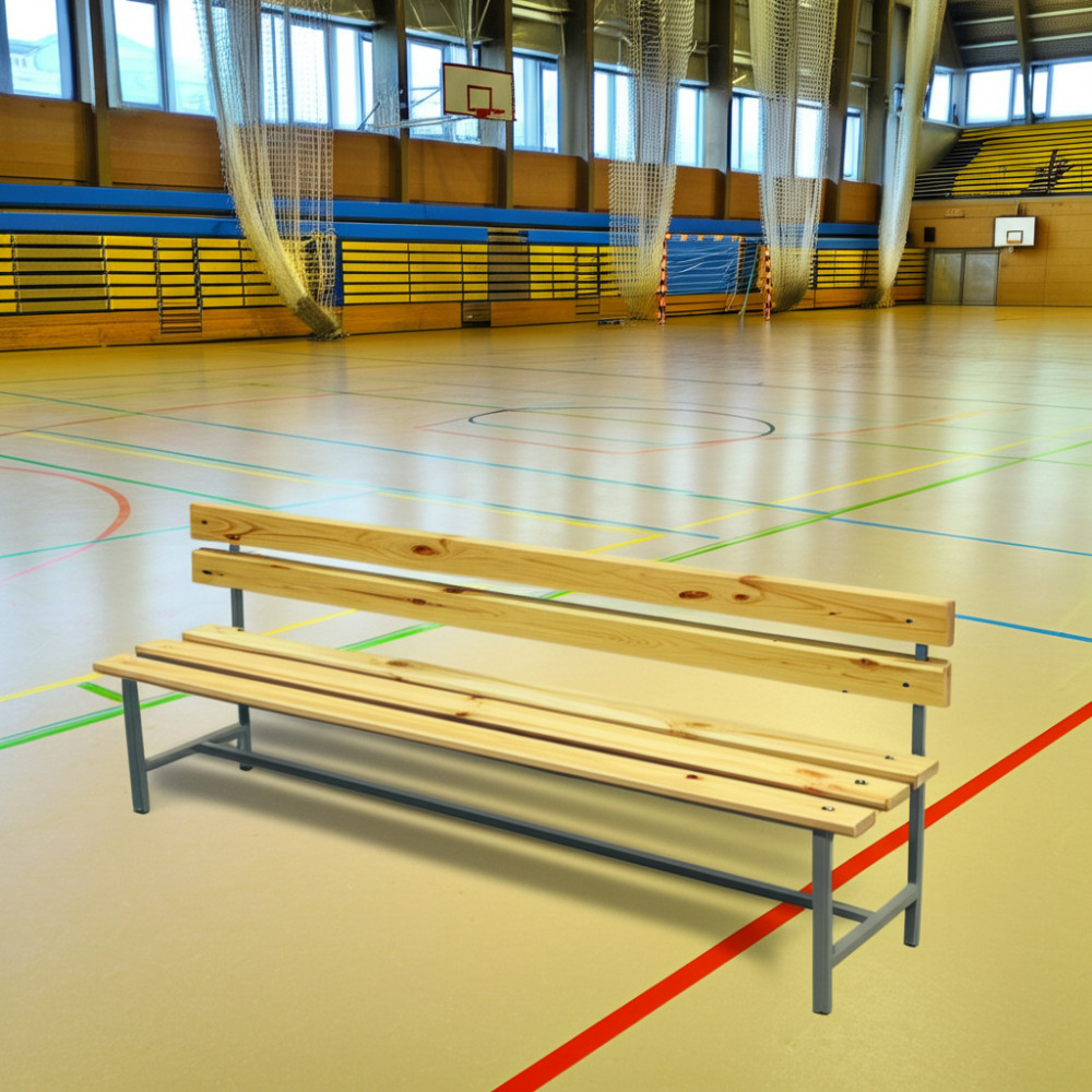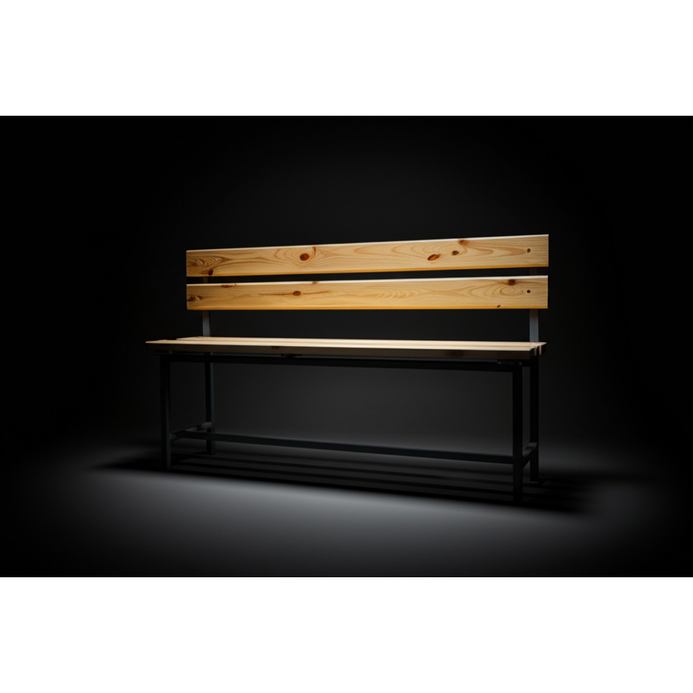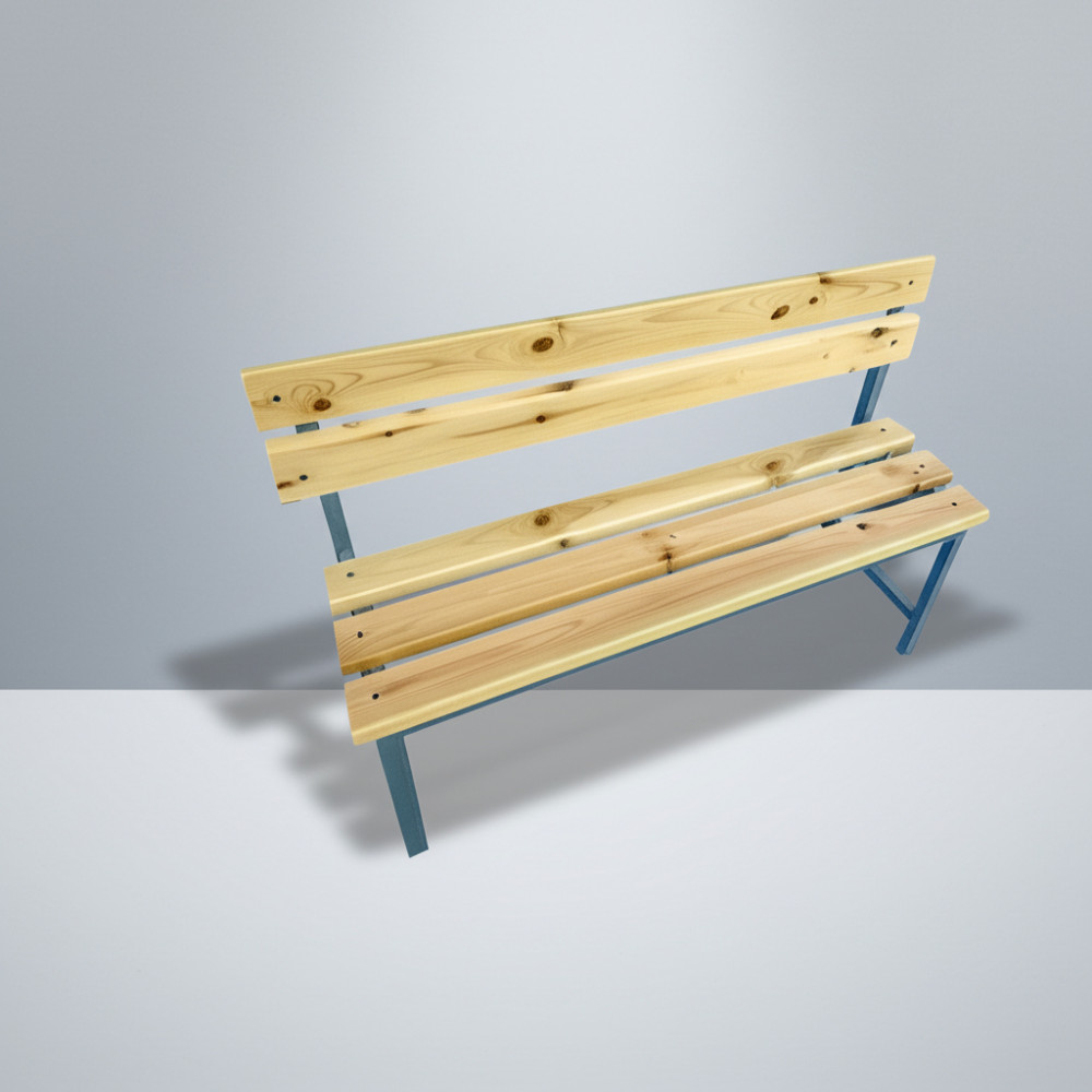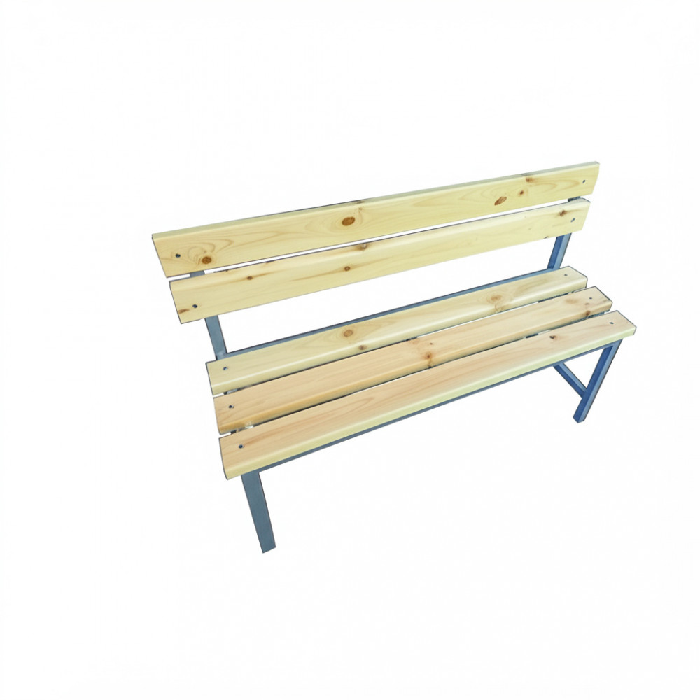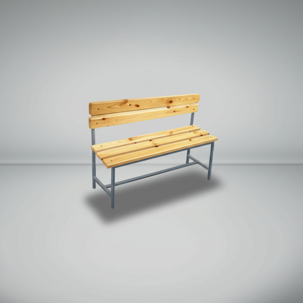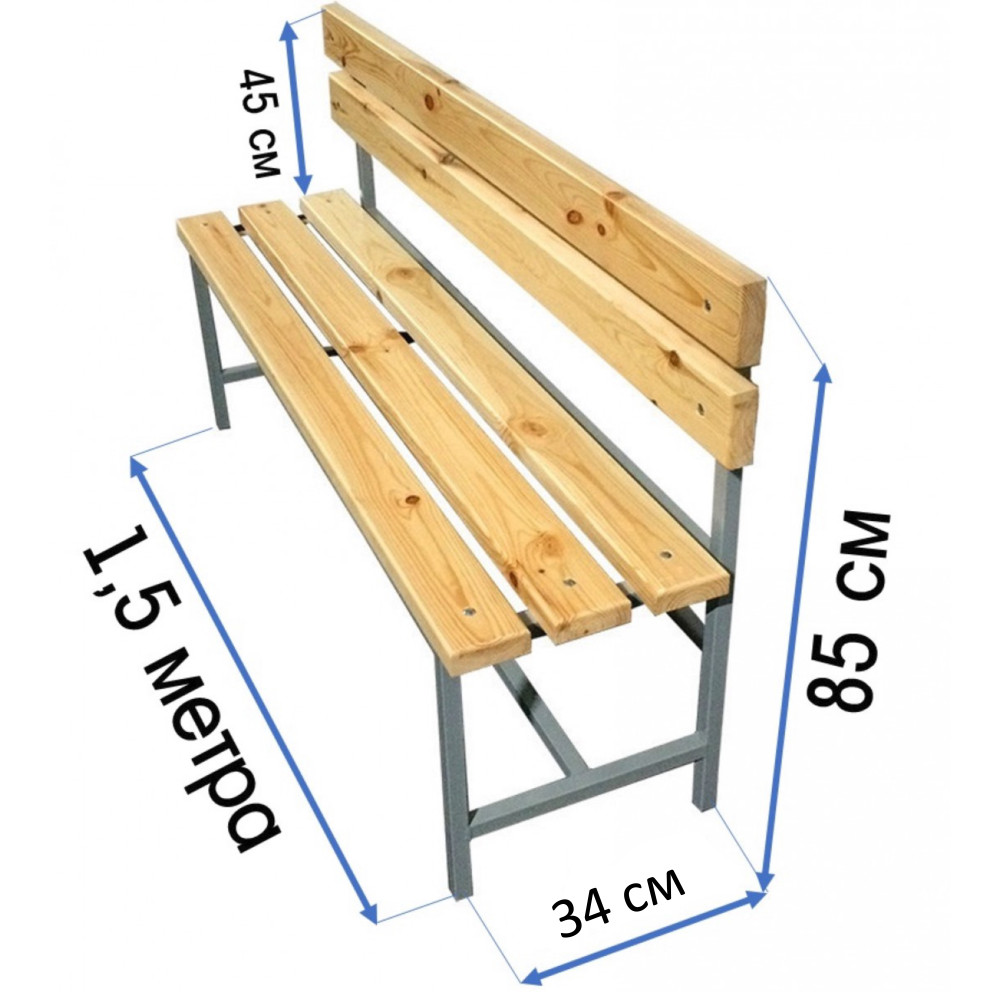 Скамейка со спинкой для раздевалок длиной 1,5 м, изготовленная из качественных материалов для обеспечения прочности и долговечности.