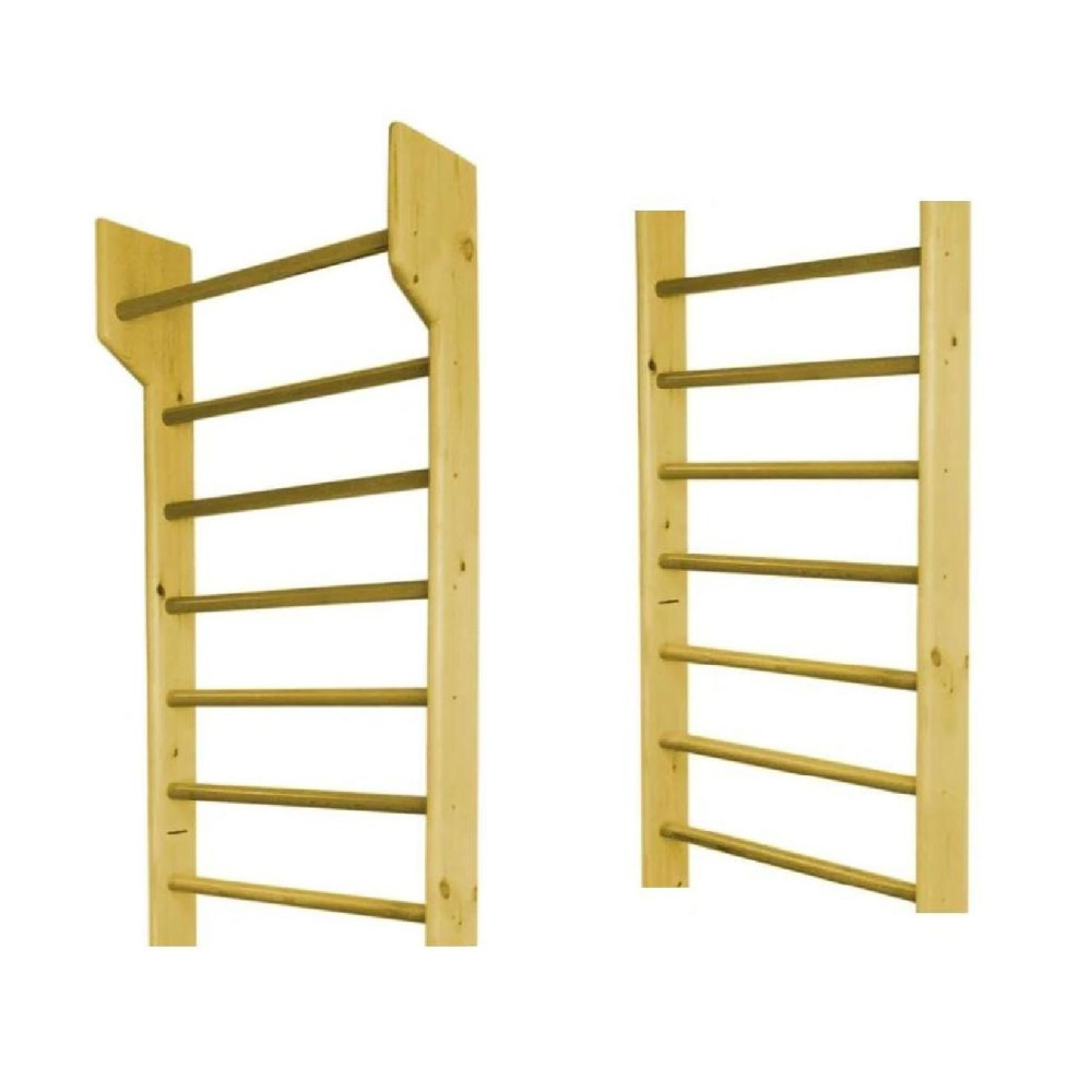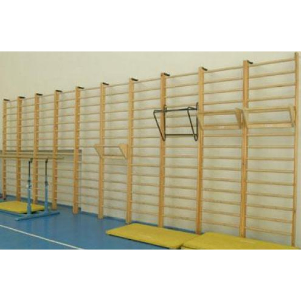 Гимнастическая стенка состоит из двух стоек, выполненных из клееного натурального дерева (обычно сосна), и перекладин из березы. Наружные края конструкции имеют закругленную форму, что снижает риск травм при занятиях. Поверхность стенки обработана и покрыта качественным трёхкомпонентным лаком, что увеличивает срок службы и устойчивость к механическим повреждениям. Крепление к стене и полу осуществляется с помощью кронштейнов.