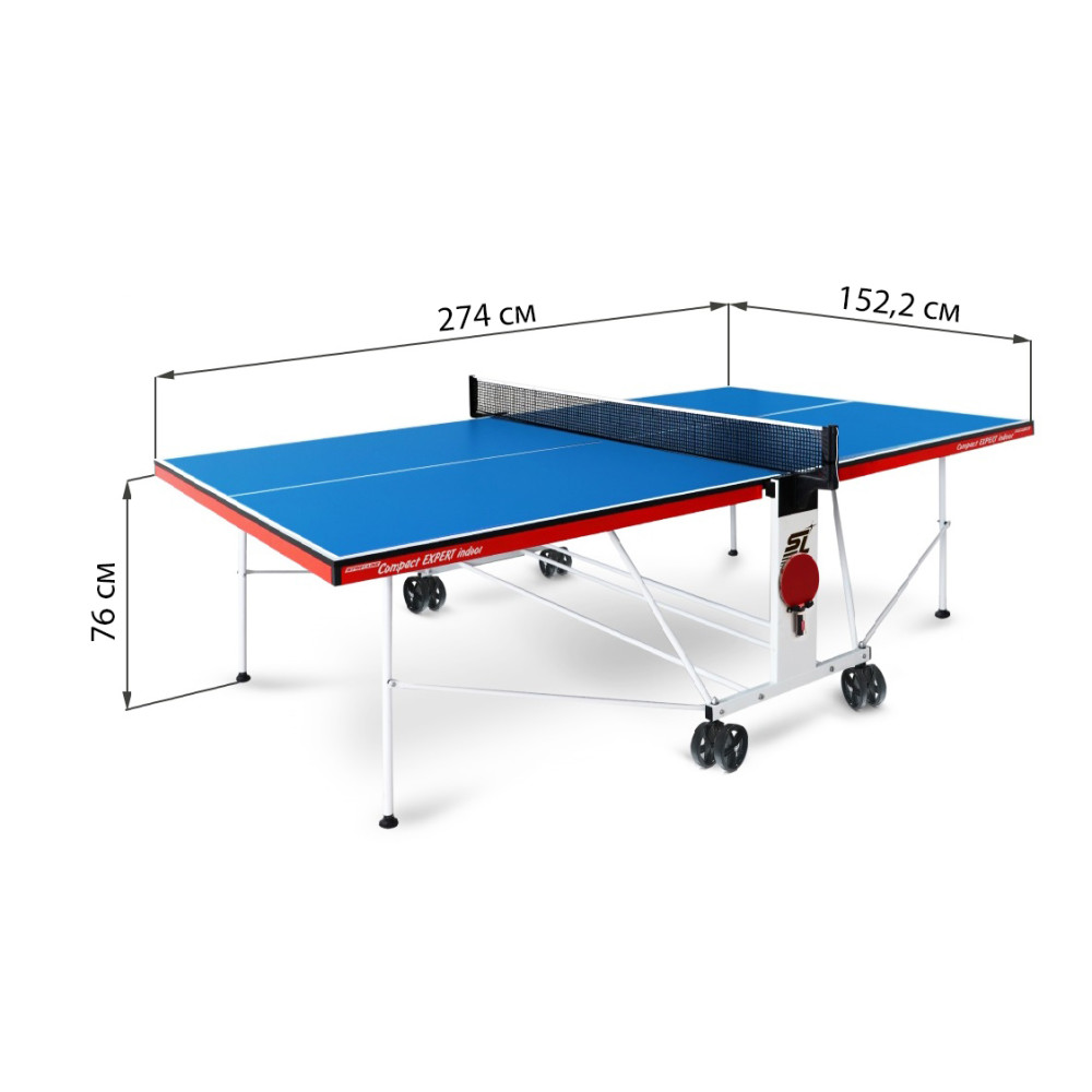 Теннисный стол Compact Expert Indoor с размерами 274 см в длину, 152,5 см в ширину и 76 см в высоту идеально подходит для игры в закрытых помещениях.