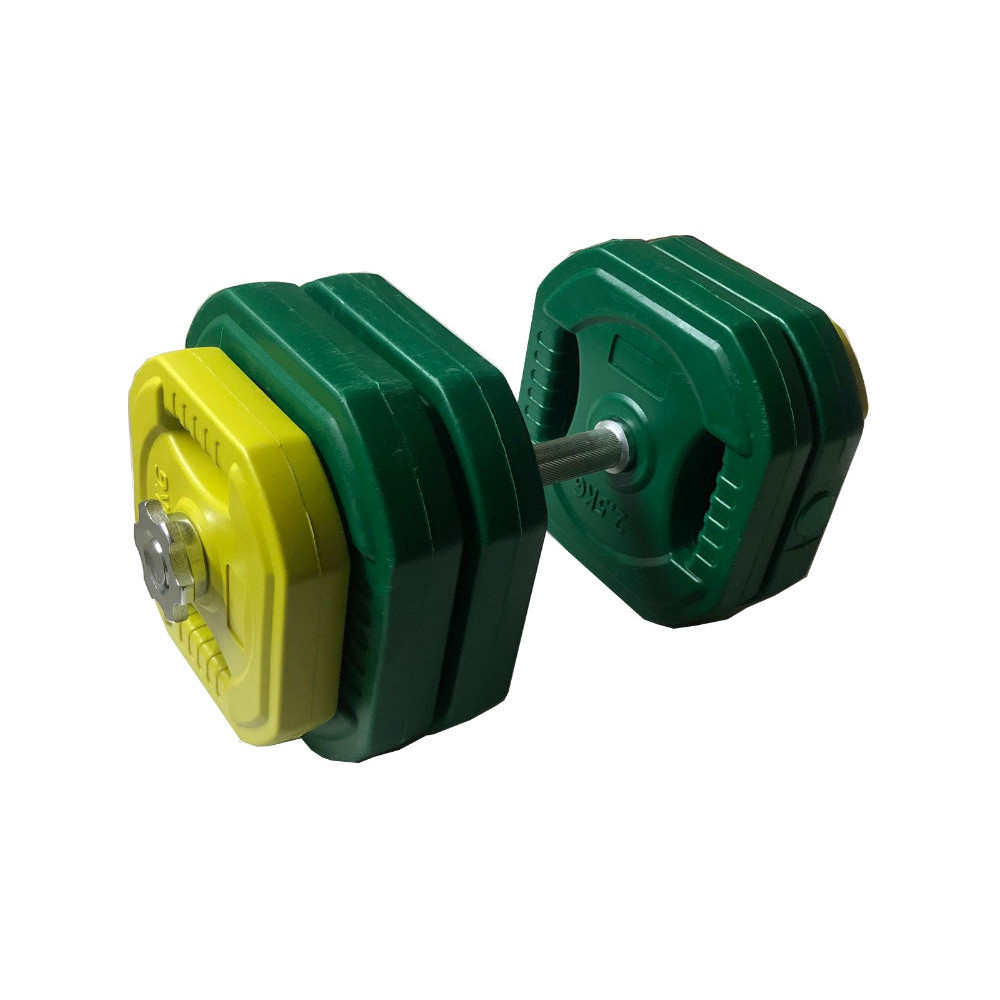 Гантель разборная весом 14,0 кг с цветными дисками и хватом, подходящая как для начинающих, так и для профессиональных спортсменов.