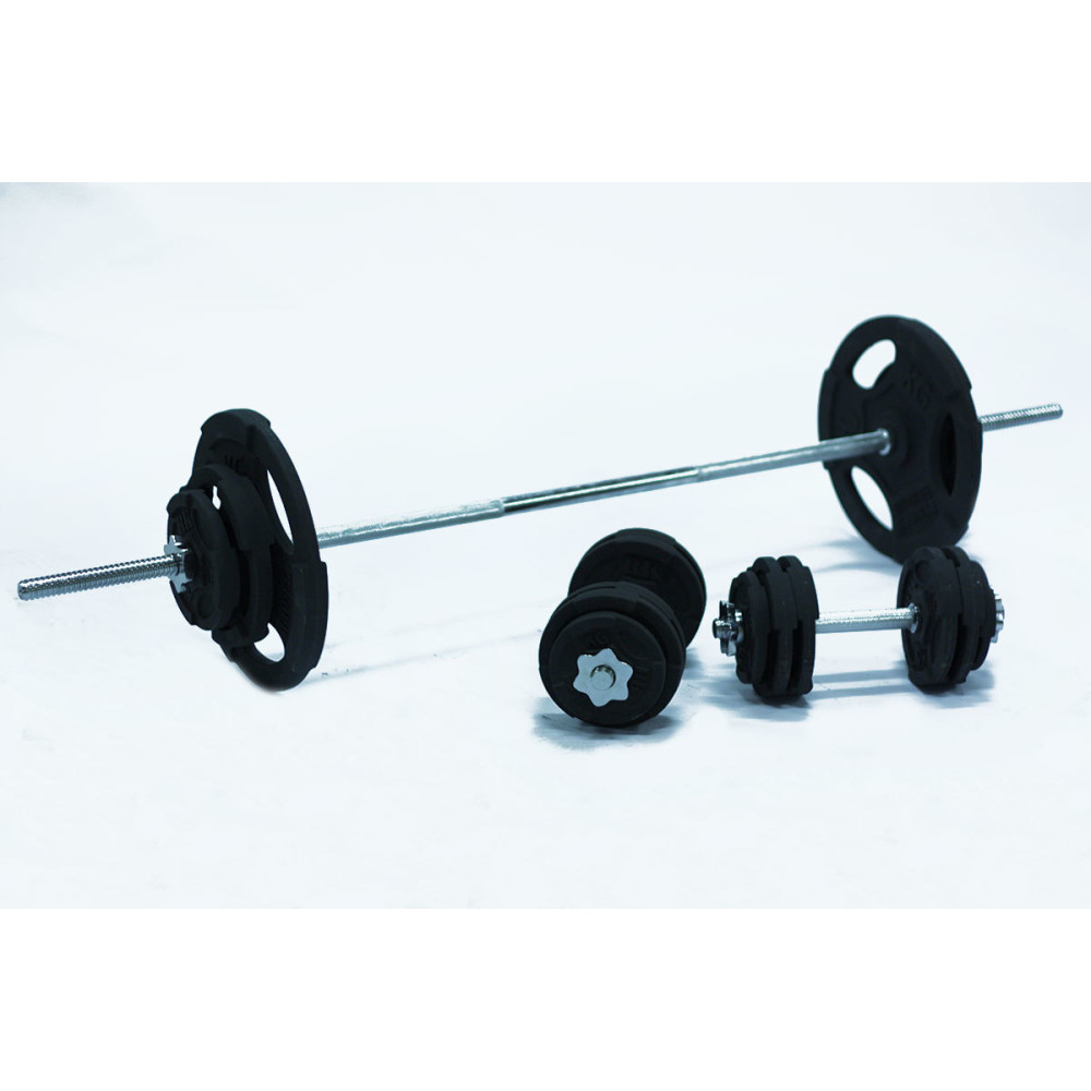 Комплект штанга и гантели MironFit включает в себя 70 кг весов и обеспечивает разнообразные тренировки в домашних условиях благодаря универсальному набору.