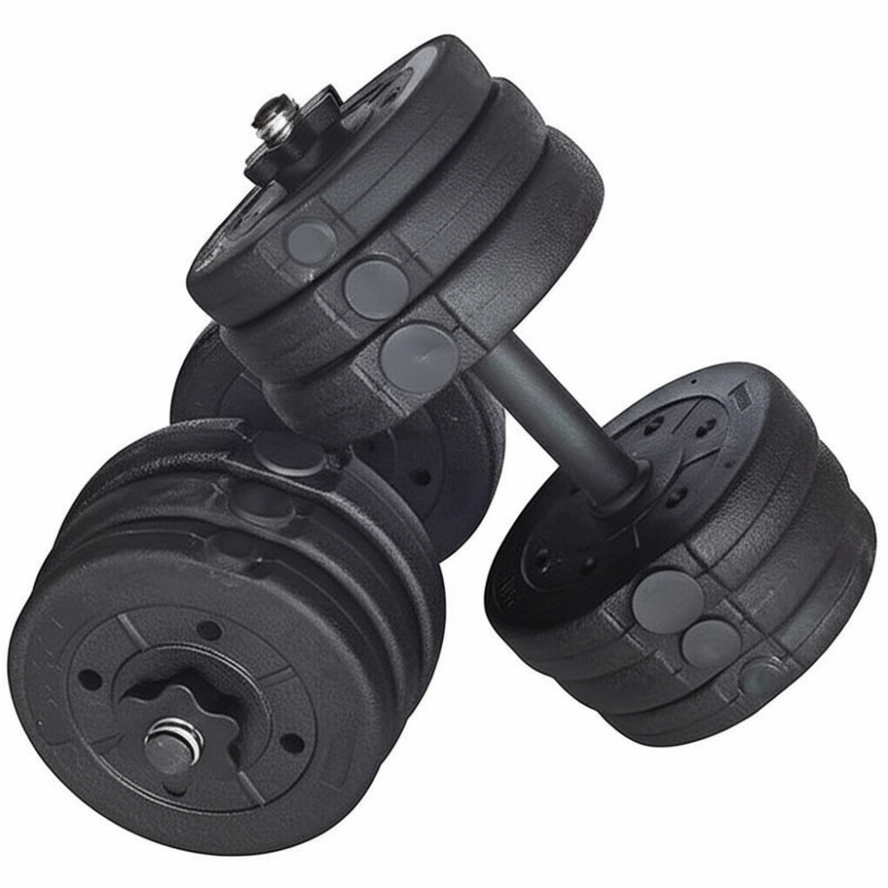Гантельный набор разборный DBP-25, состоящий из двух гантелей по 12,5 кг каждая, выполненный из высококачественного пластика и цемента, идеально подходит для тренировок как начинающих, так и опытных спортсменов.