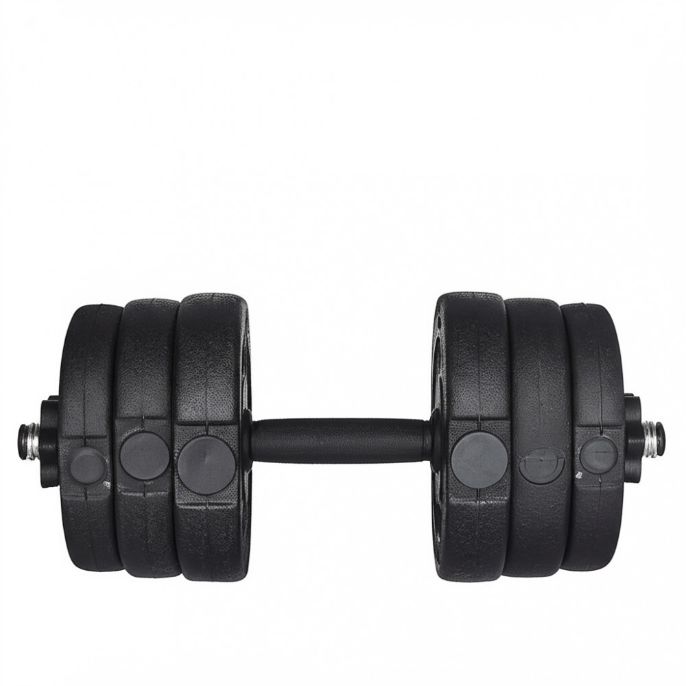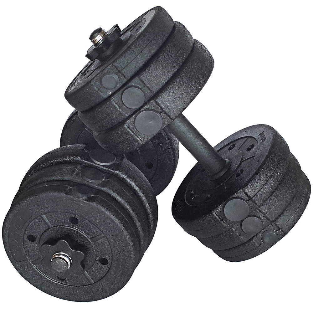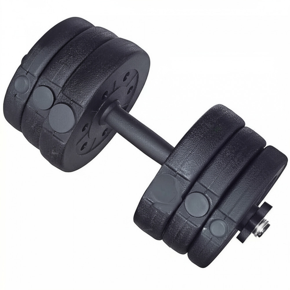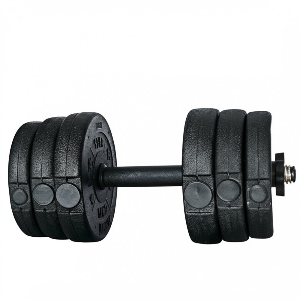Гантельный набор разборный DBP-30 состоит из двух гантелей по 15 кг каждая, выполненный из высококачественного пластика и цемента, общим весом 30 кг.