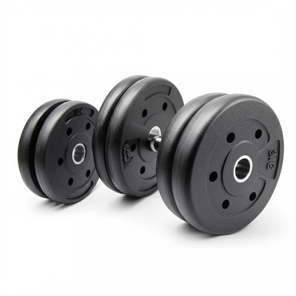 Диск пластиковый/цемент черного цвета с диаметром посадочного отверстия 25-26 мм и весом 10 кг предназначен для тренировок и подходит как для домашних, так и для профессиональных залов.