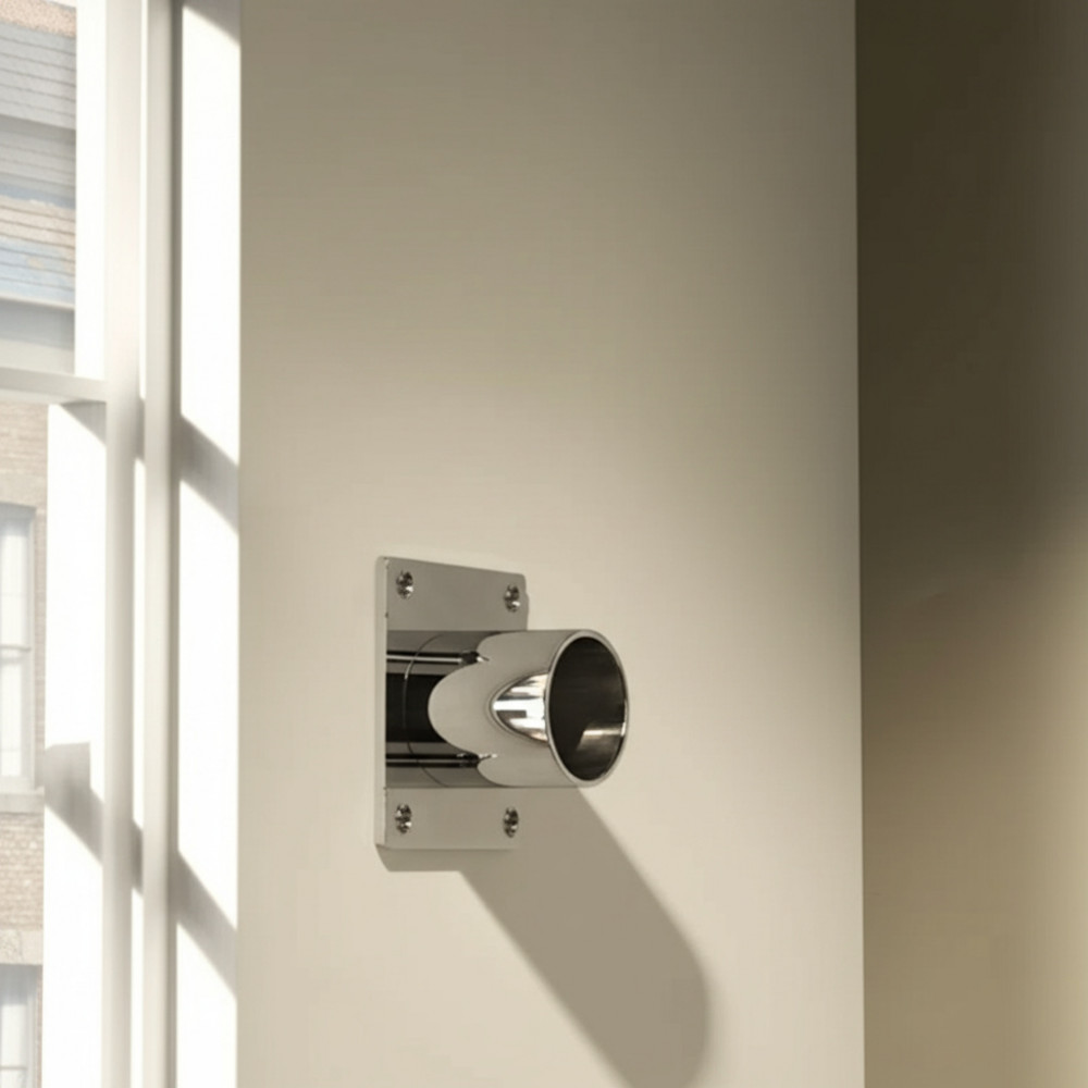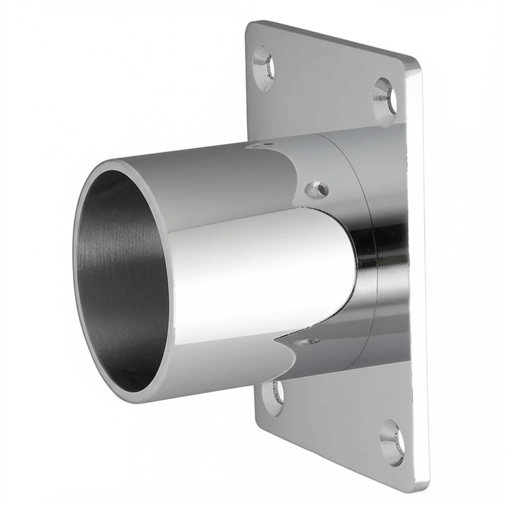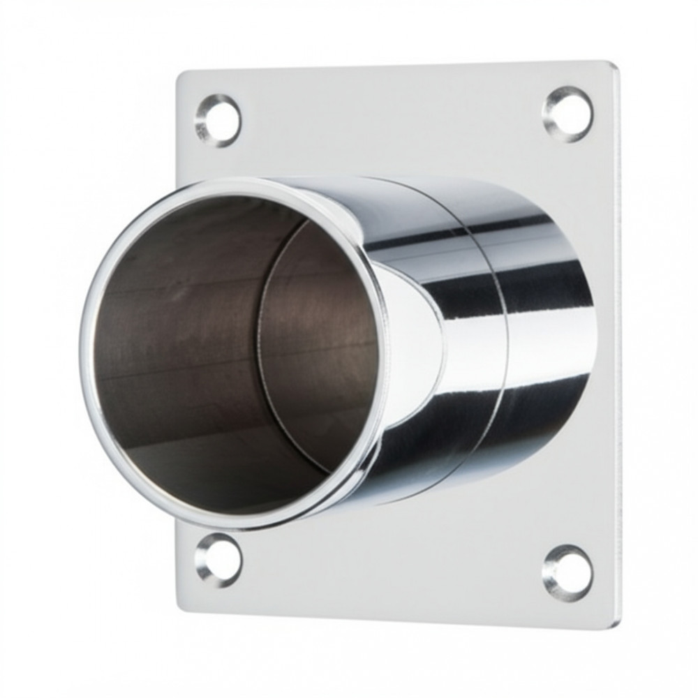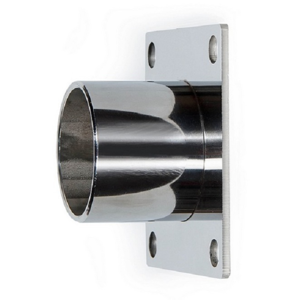 Торцевой кронштейн из нержавеющей стали диаметром 50 мм и размером основы 100x100 мм предназначен для надежного крепления поручней балетного станка к стене.
